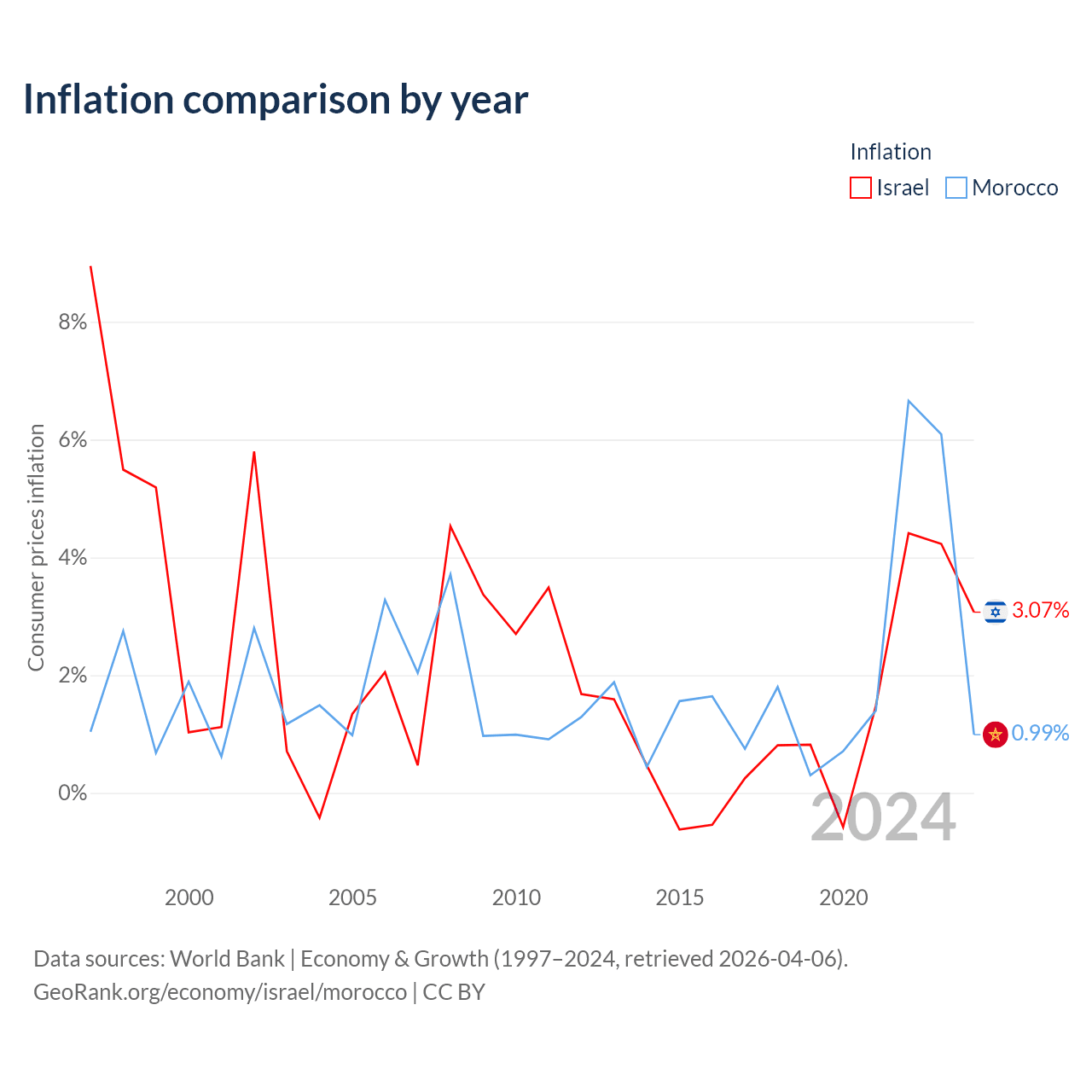 Israel has a GDP of $540B compared to $161B for Morocco, ranking 29/197 and 58/197 by economy size, respectively.