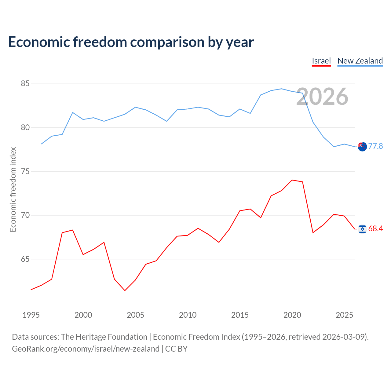The Economic Freedom Index for Israel is 68.4, ranking 47/197, compared to 77.8 for New Zealand, ranking 13/197. The chart above displays a comparison of annual changes in economic freedom indexes.