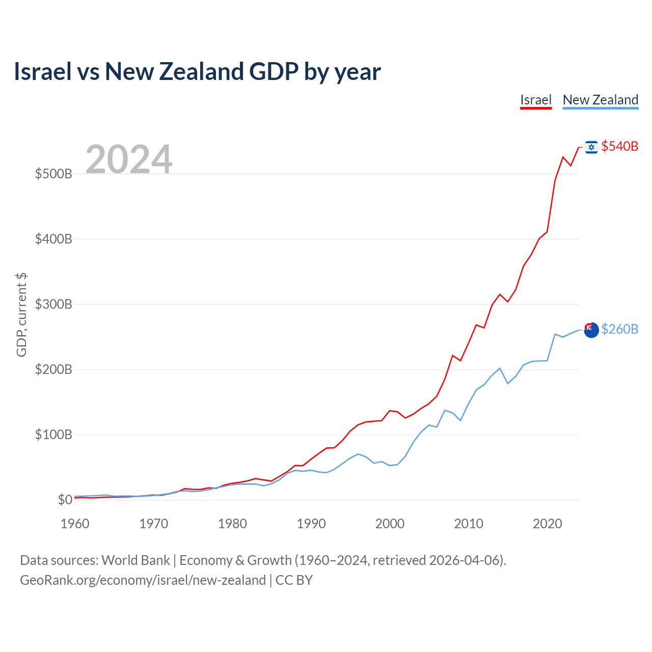 Israel has a GDP of $540B compared to $260B for New Zealand, ranking 29/197 and 52/197 by economy size, respectively.