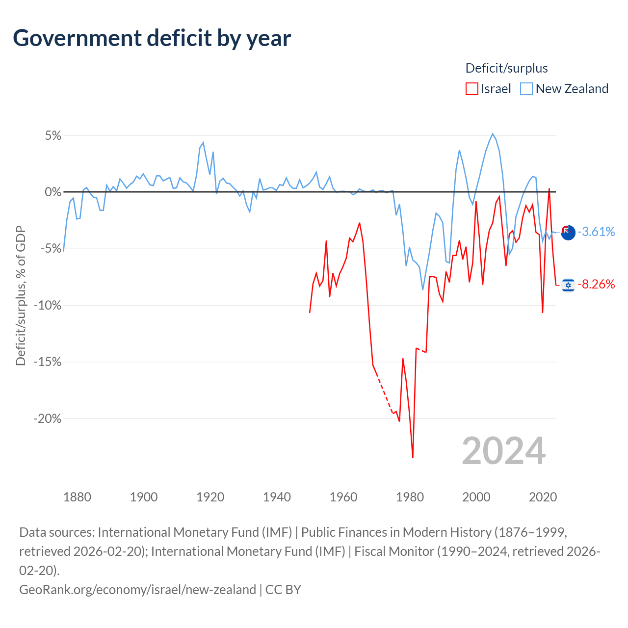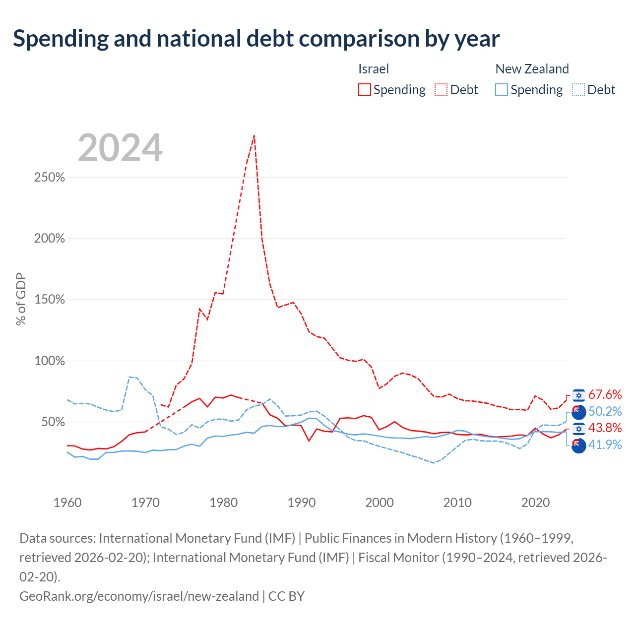 Israel has $366B in government debt (67.6% of GDP), compared to $131B (50.2% of GDP) in New Zealand.