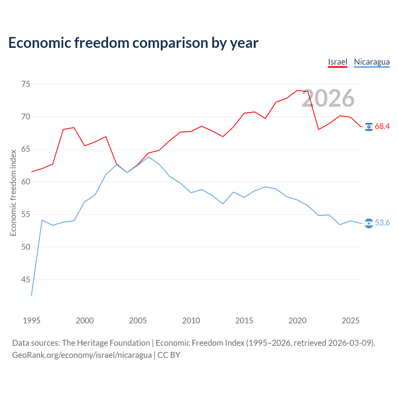 The Economic Freedom Index for Israel is 68.4, ranking 47/197, compared to 53.6 for Nicaragua, ranking 139/197. The chart above displays a comparison of annual changes in economic freedom indexes.