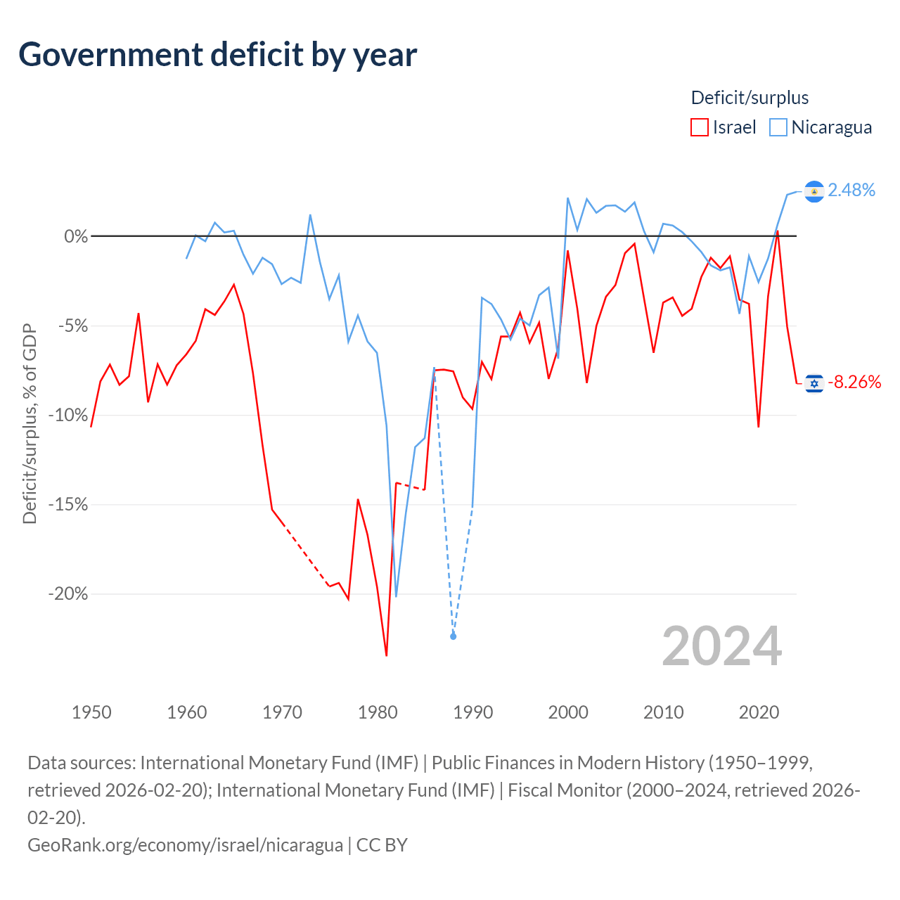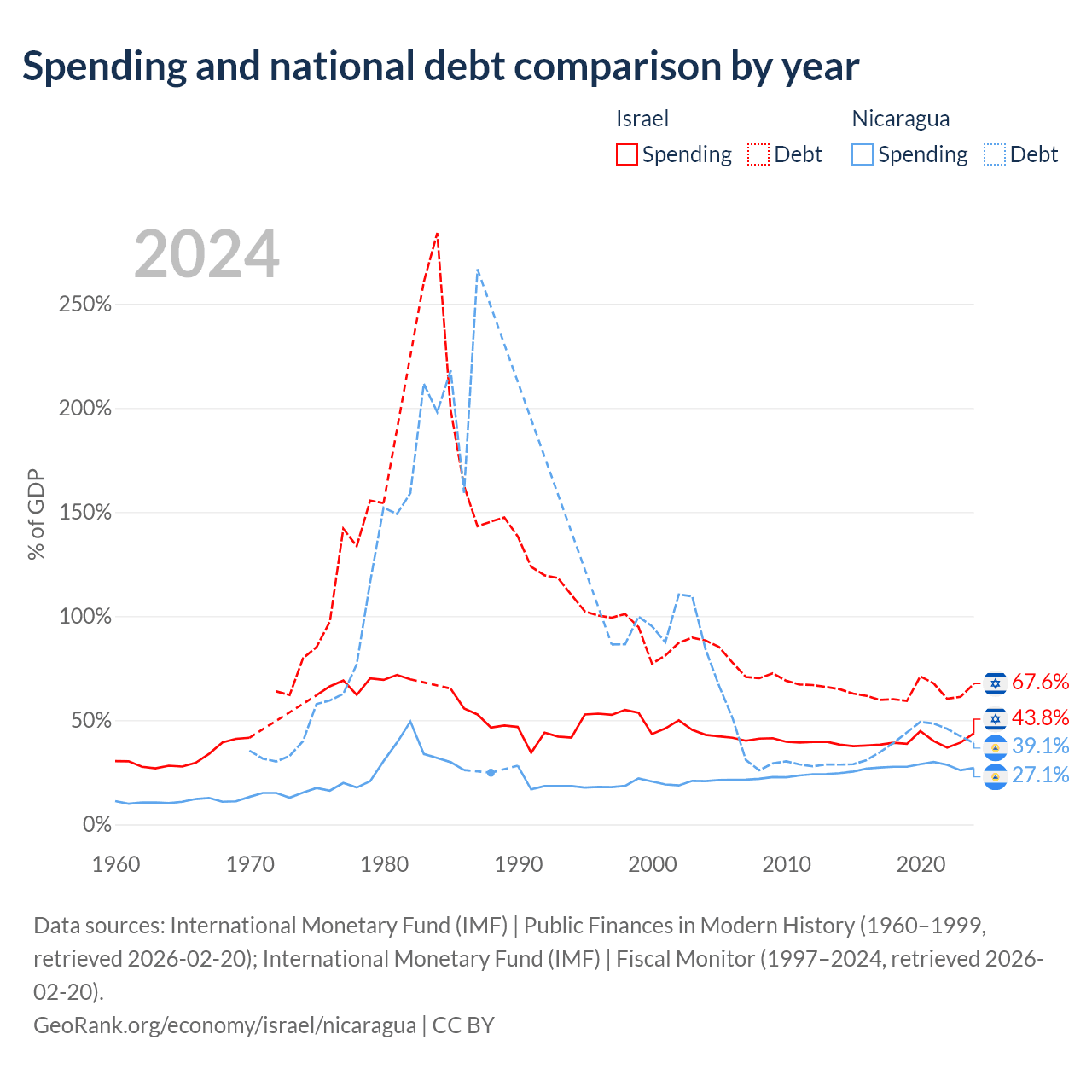 Israel has $366B in government debt (67.6% of GDP), compared to $7.71B (39.1% of GDP) in Nicaragua.