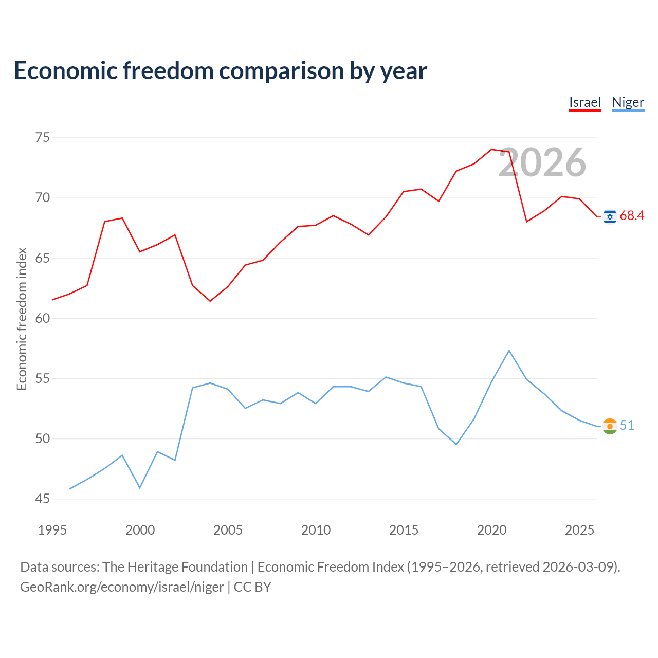 The Economic Freedom Index for Israel is 68.4, ranking 47/197, compared to 51 for Niger, ranking 156/197. The chart above displays a comparison of annual changes in economic freedom indexes.