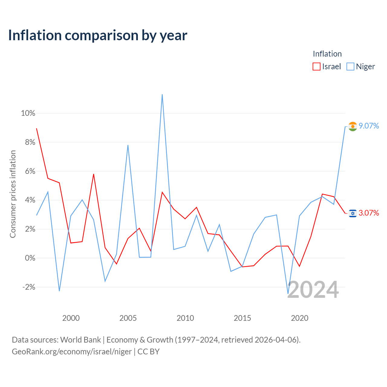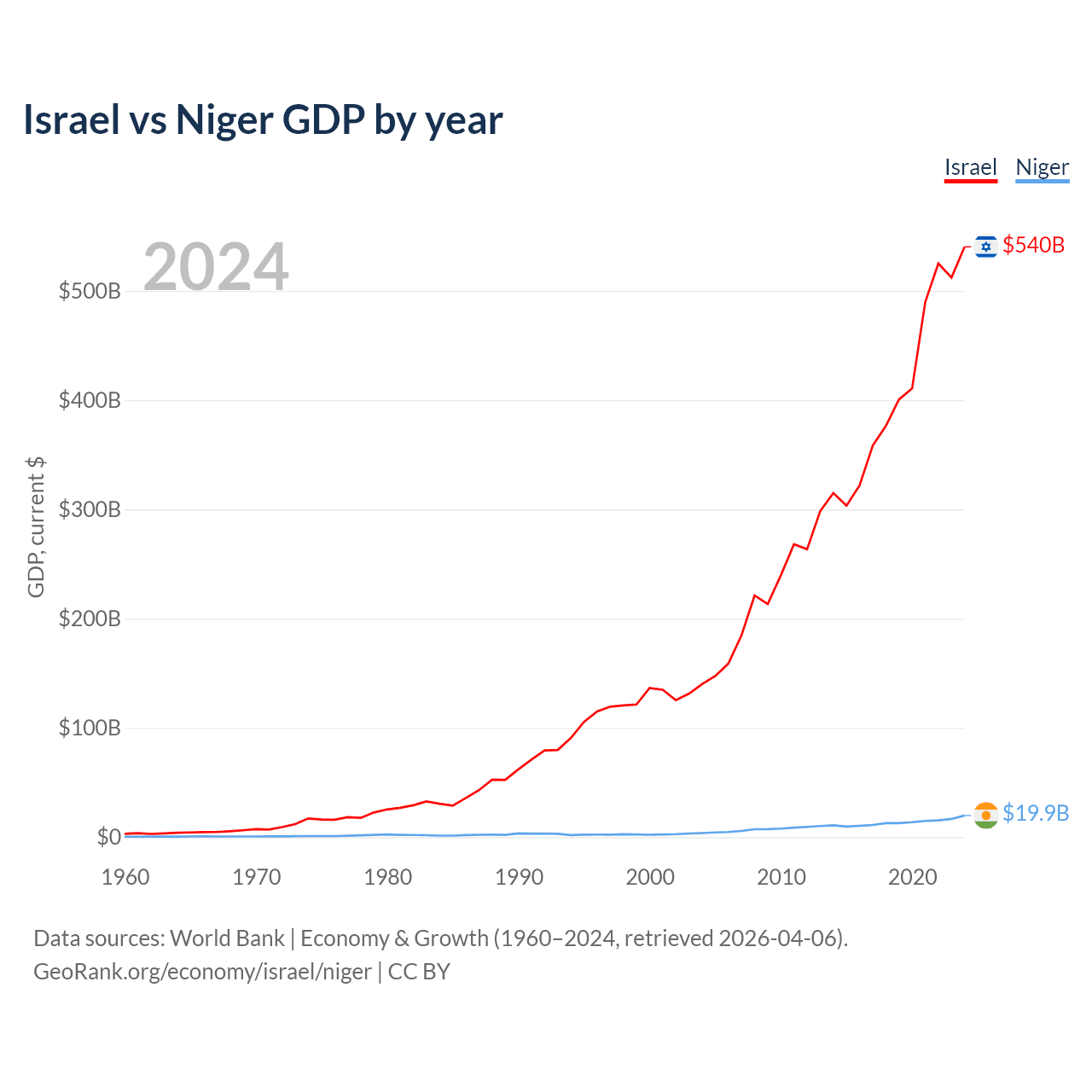 Israel has a GDP of $540B compared to $19.9B for Niger, ranking 29/197 and 130/197 by economy size, respectively.