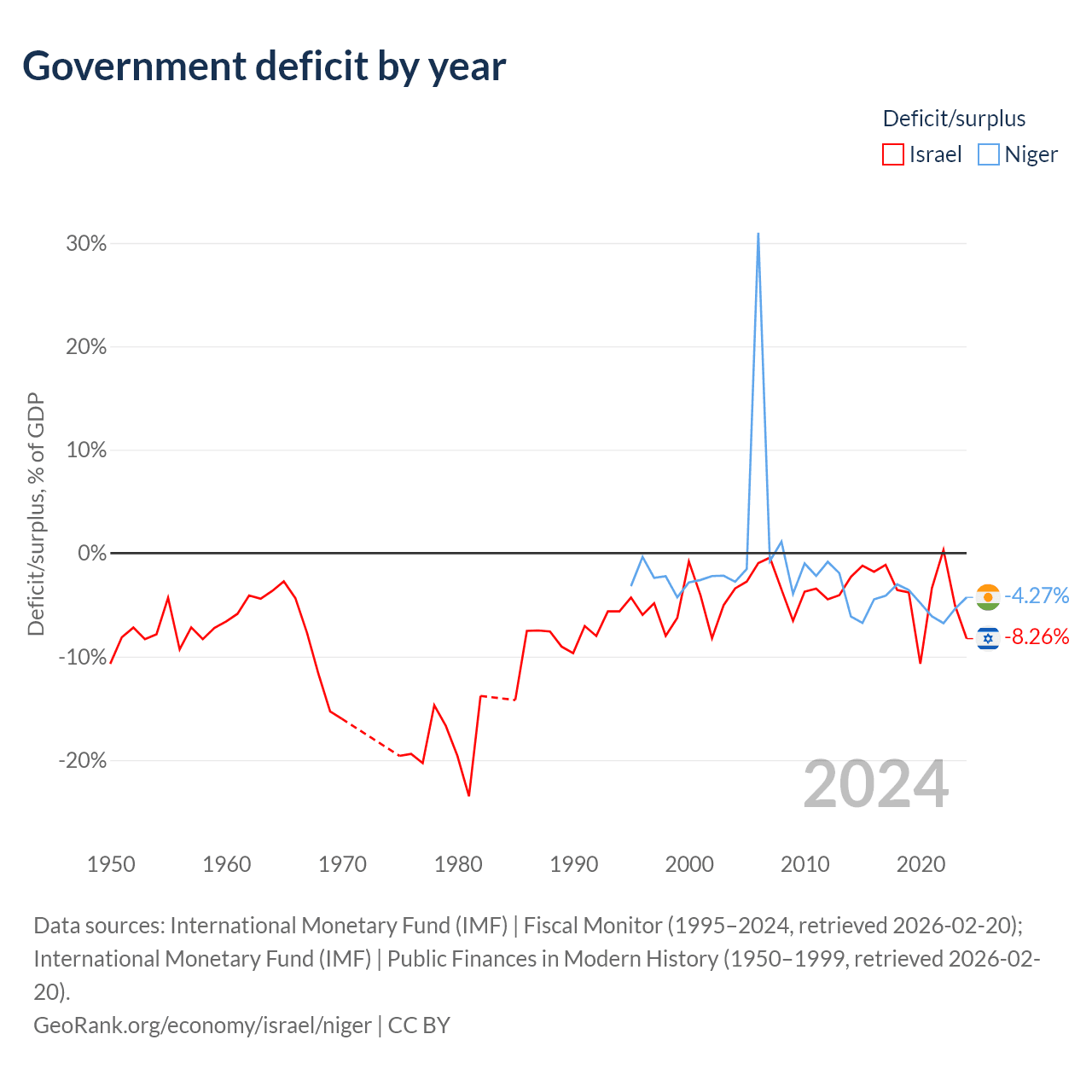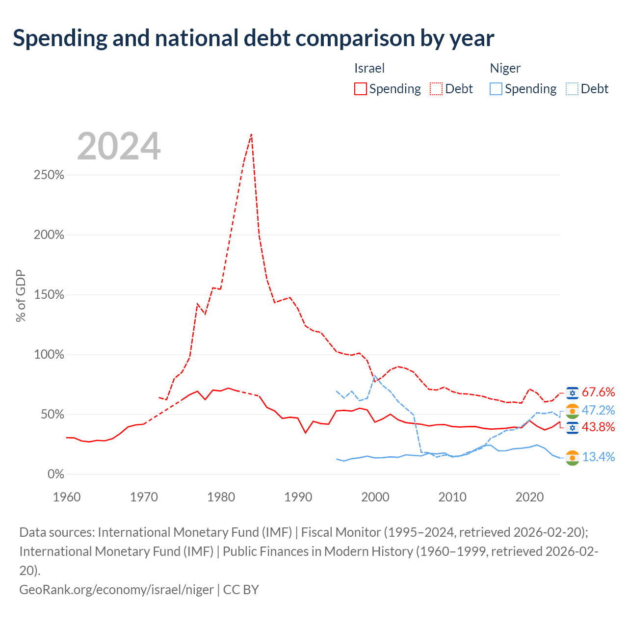 Israel has $366B in government debt (67.6% of GDP), compared to $9.39B (47.2% of GDP) in Niger.