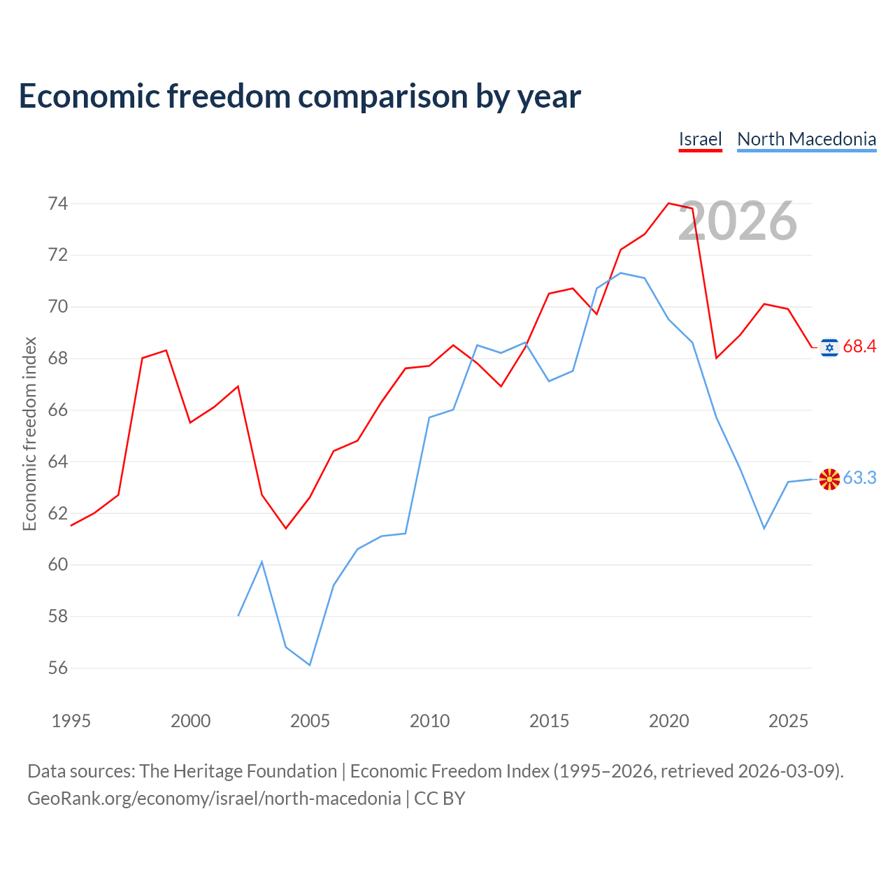 The Economic Freedom Index for Israel is 68.4, ranking 47/197, compared to 63.3 for North Macedonia, ranking 81/197. The chart above displays a comparison of annual changes in economic freedom indexes.