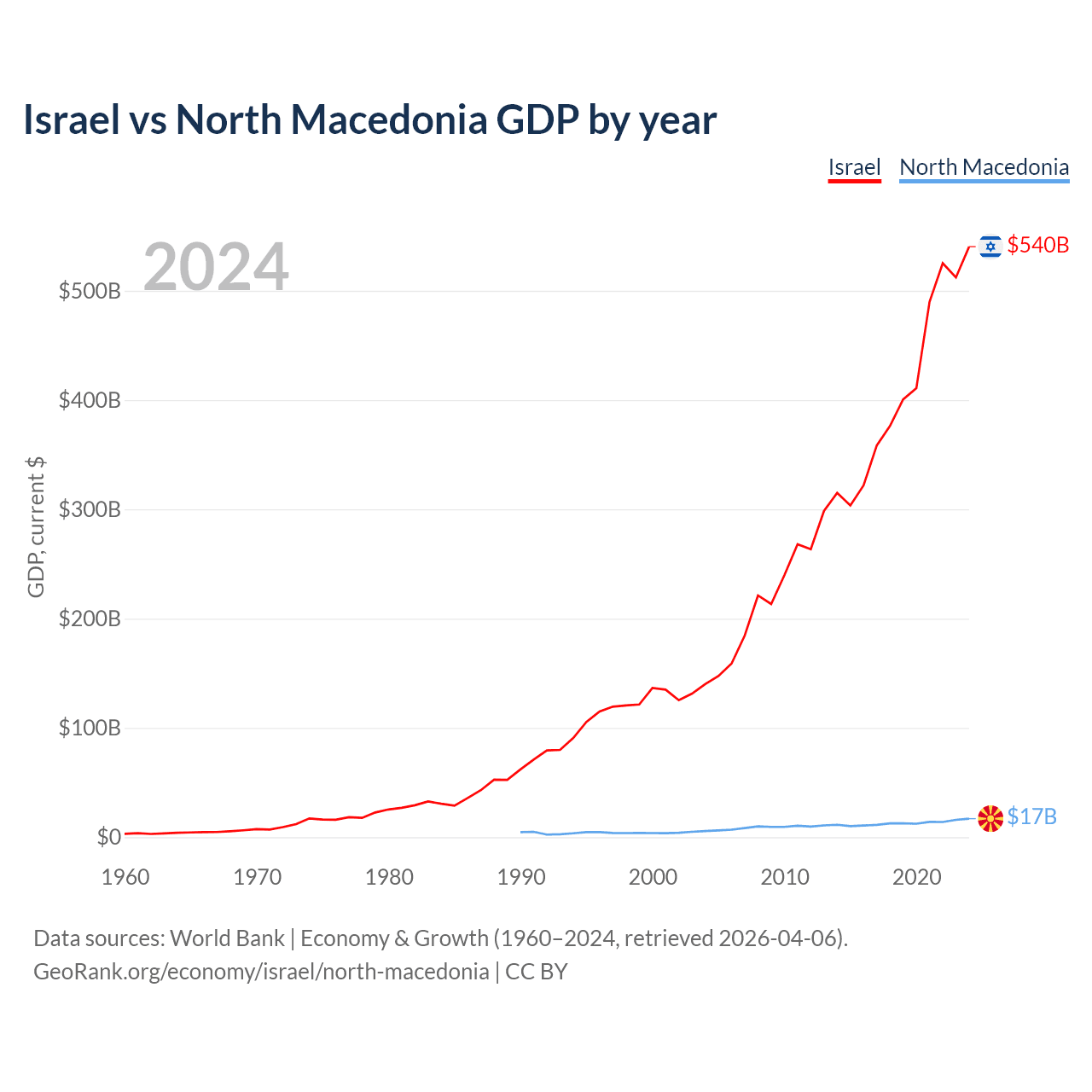 Israel has a GDP of $540B compared to $17B for North Macedonia, ranking 29/197 and 138/197 by economy size, respectively.