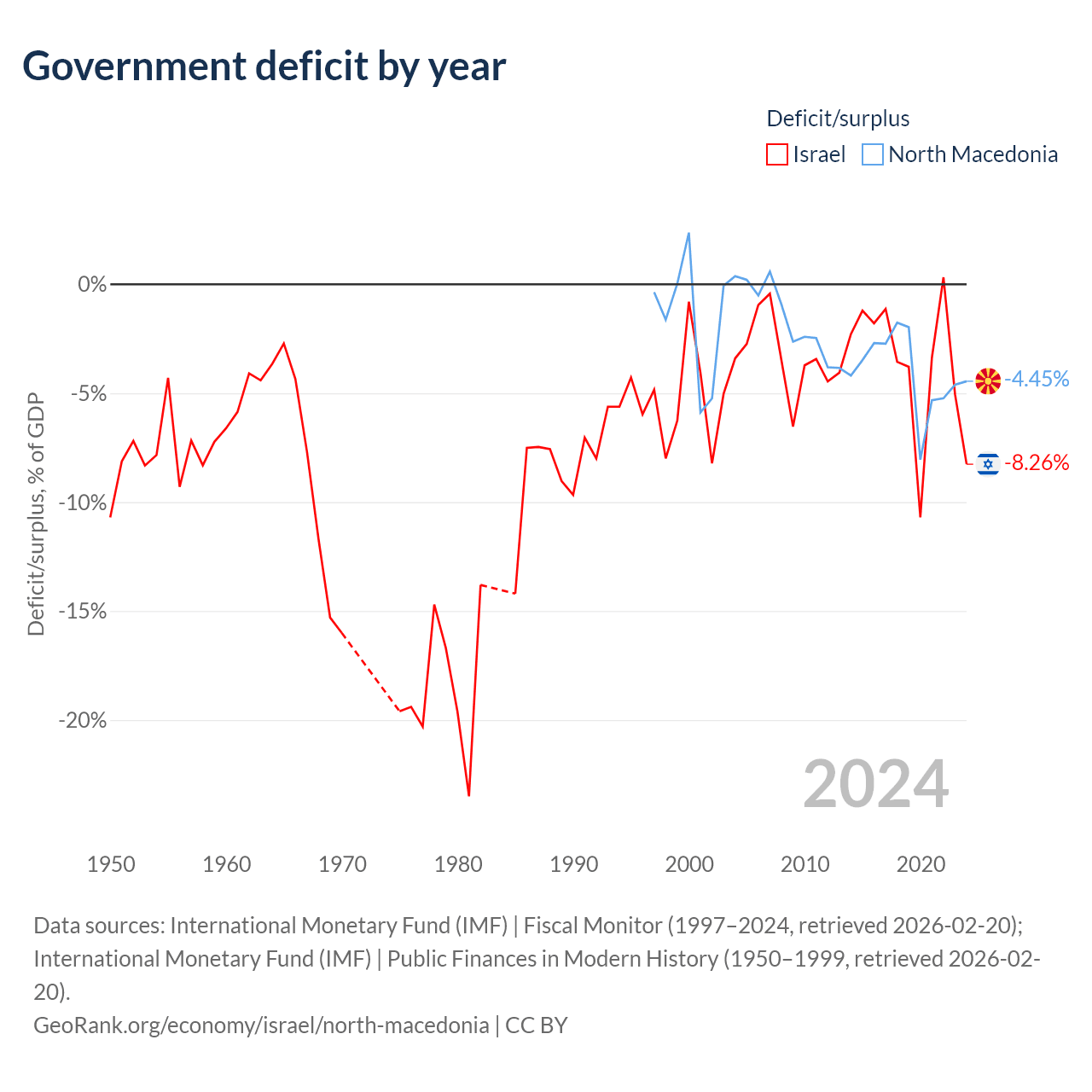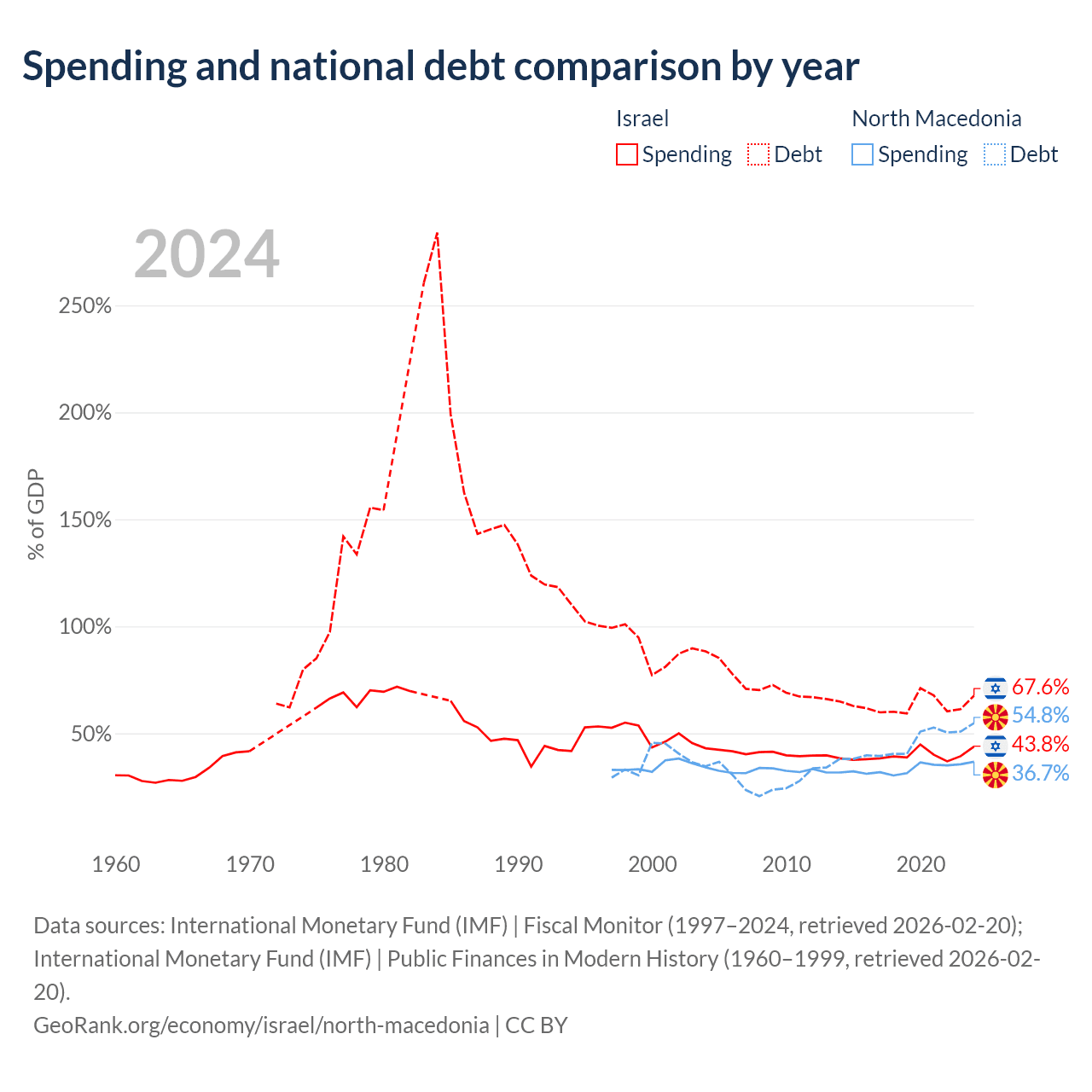 Israel has $366B in government debt (67.6% of GDP), compared to $9.3B (54.8% of GDP) in North Macedonia.