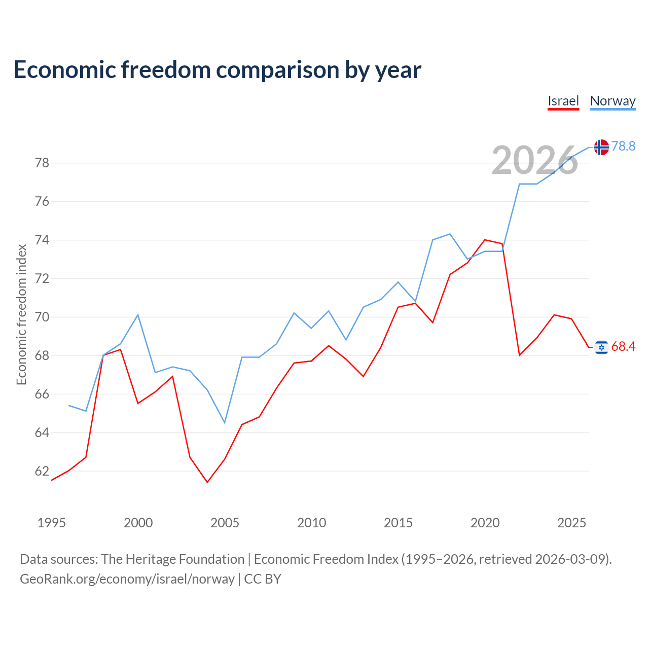 The Economic Freedom Index for Israel is 68.4, ranking 47/197, compared to 78.8 for Norway, ranking 9/197. The chart above displays a comparison of annual changes in economic freedom indexes.