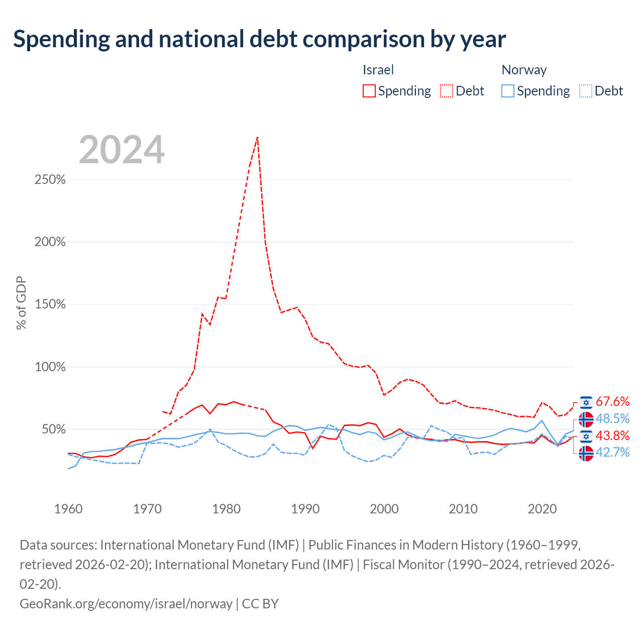 Israel has $366B in government debt (67.6% of GDP), compared to $207B (42.7% of GDP) in Norway.