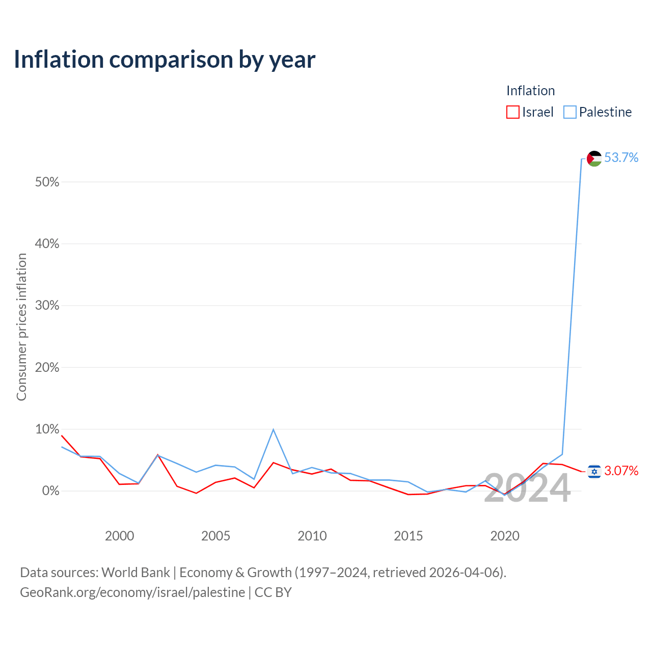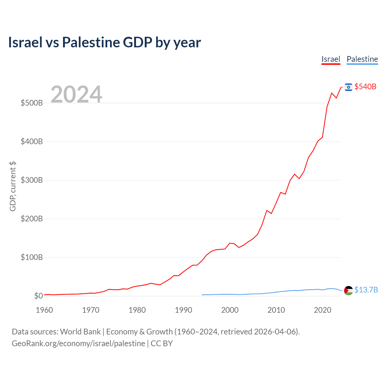 Israel has a GDP of $540B compared to $13.7B for Palestine, ranking 29/197 and 146/197 by economy size, respectively.
