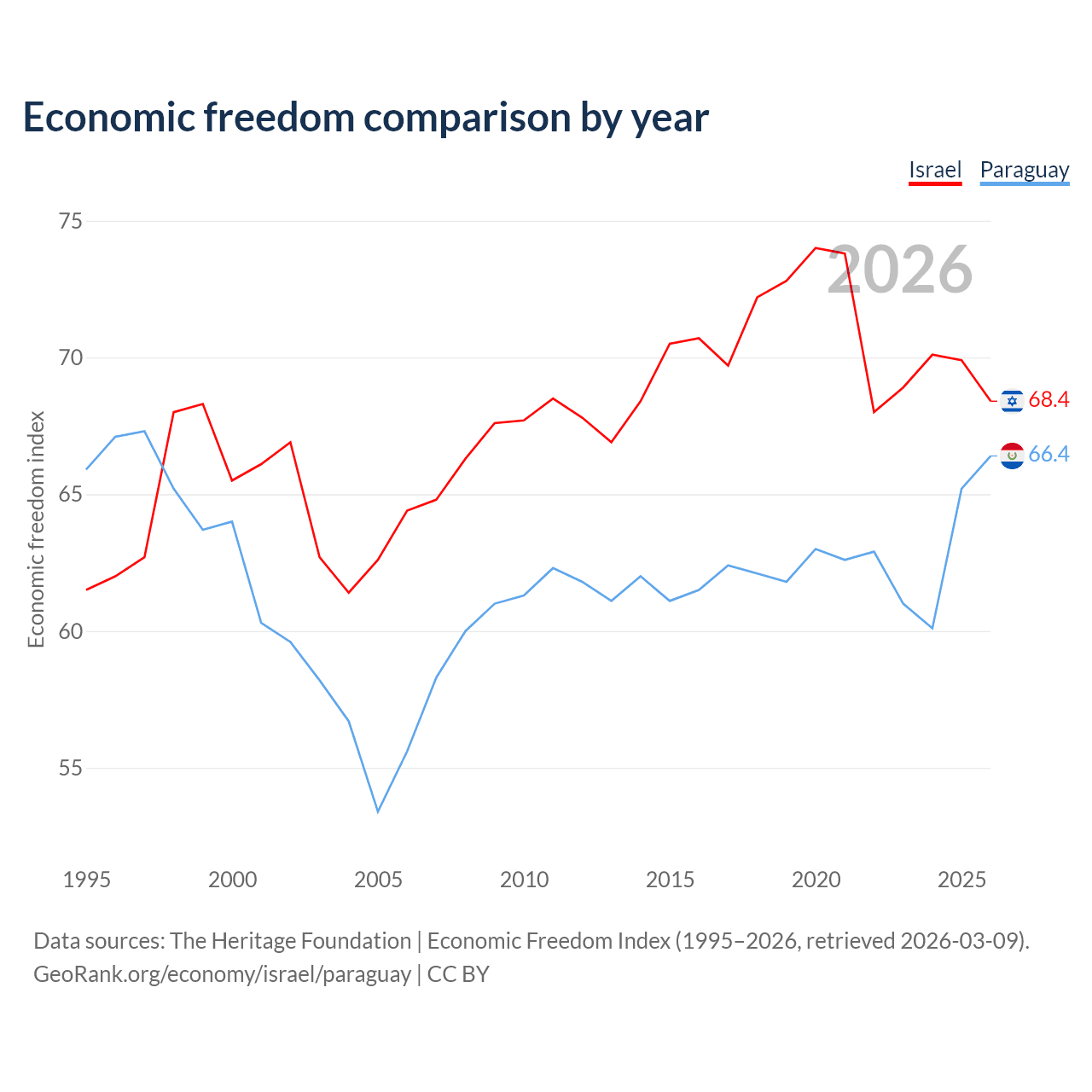 The Economic Freedom Index for Israel is 68.4, ranking 47/197, compared to 66.4 for Paraguay, ranking 61/197. The chart above displays a comparison of annual changes in economic freedom indexes.
