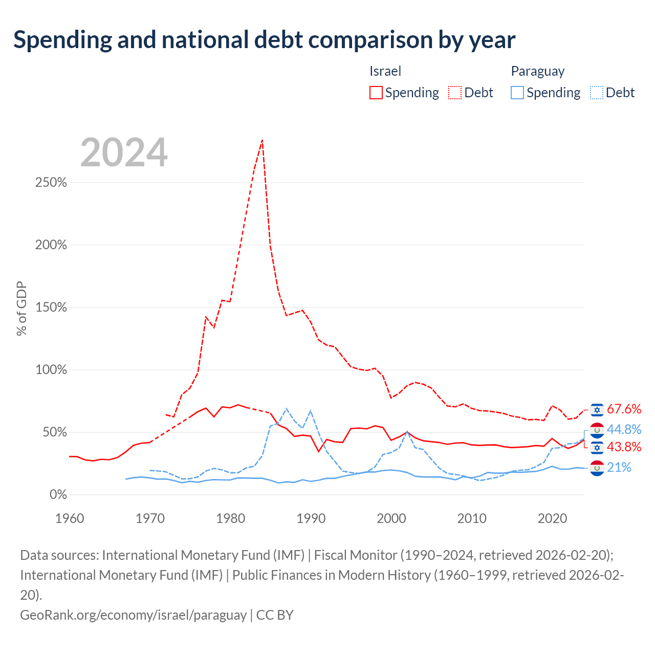 Israel has $366B in government debt (67.6% of GDP), compared to $19.9B (44.8% of GDP) in Paraguay.