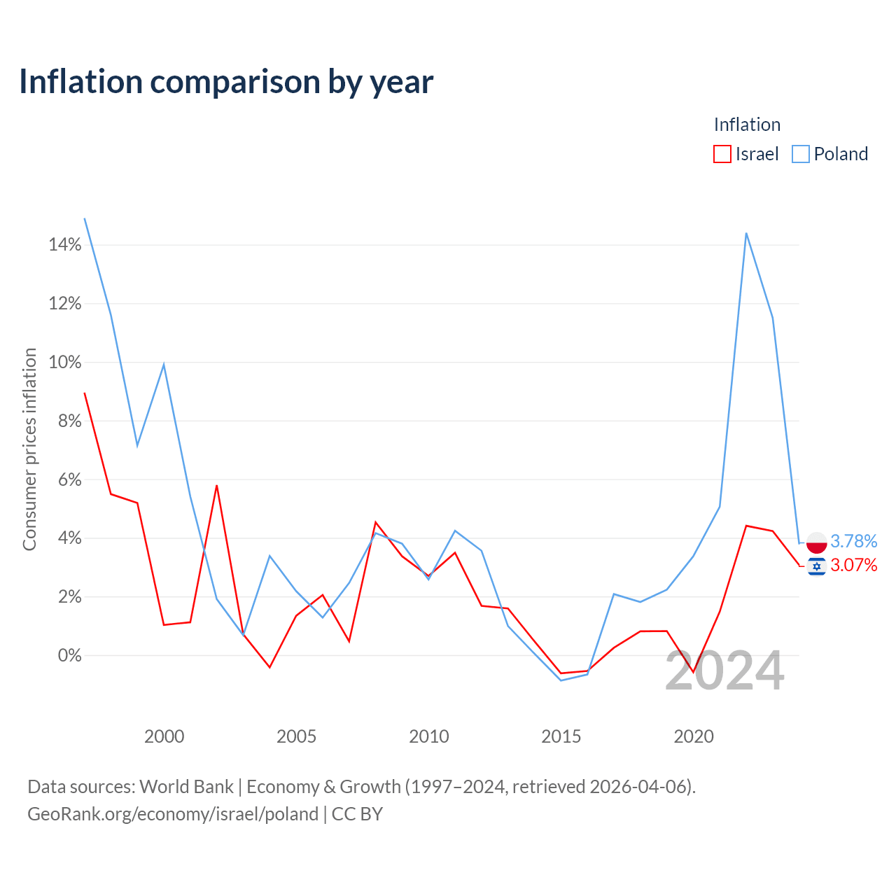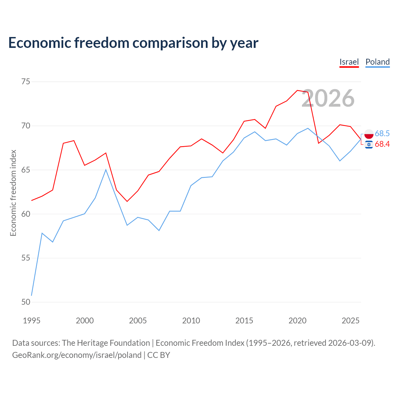 The Economic Freedom Index for Israel is 68.4, ranking 47/197, compared to 68.5 for Poland, ranking 46/197. The chart above displays a comparison of annual changes in economic freedom indexes.