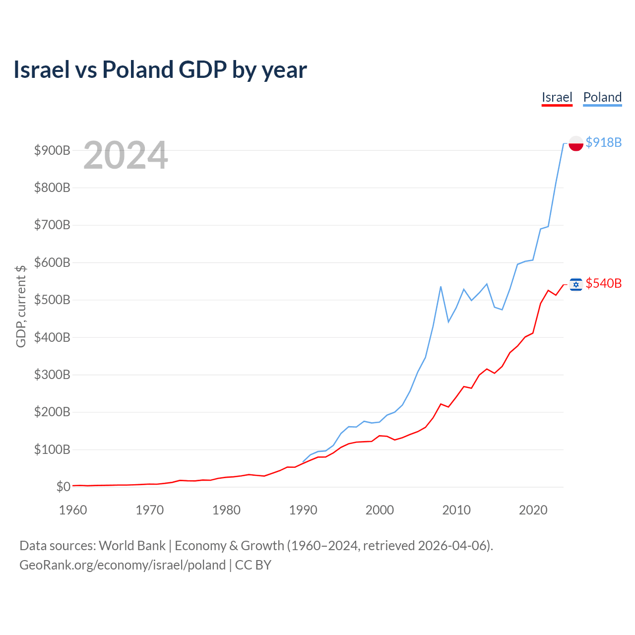 Israel has a GDP of $540B compared to $918B for Poland, ranking 29/197 and 21/197 by economy size, respectively.