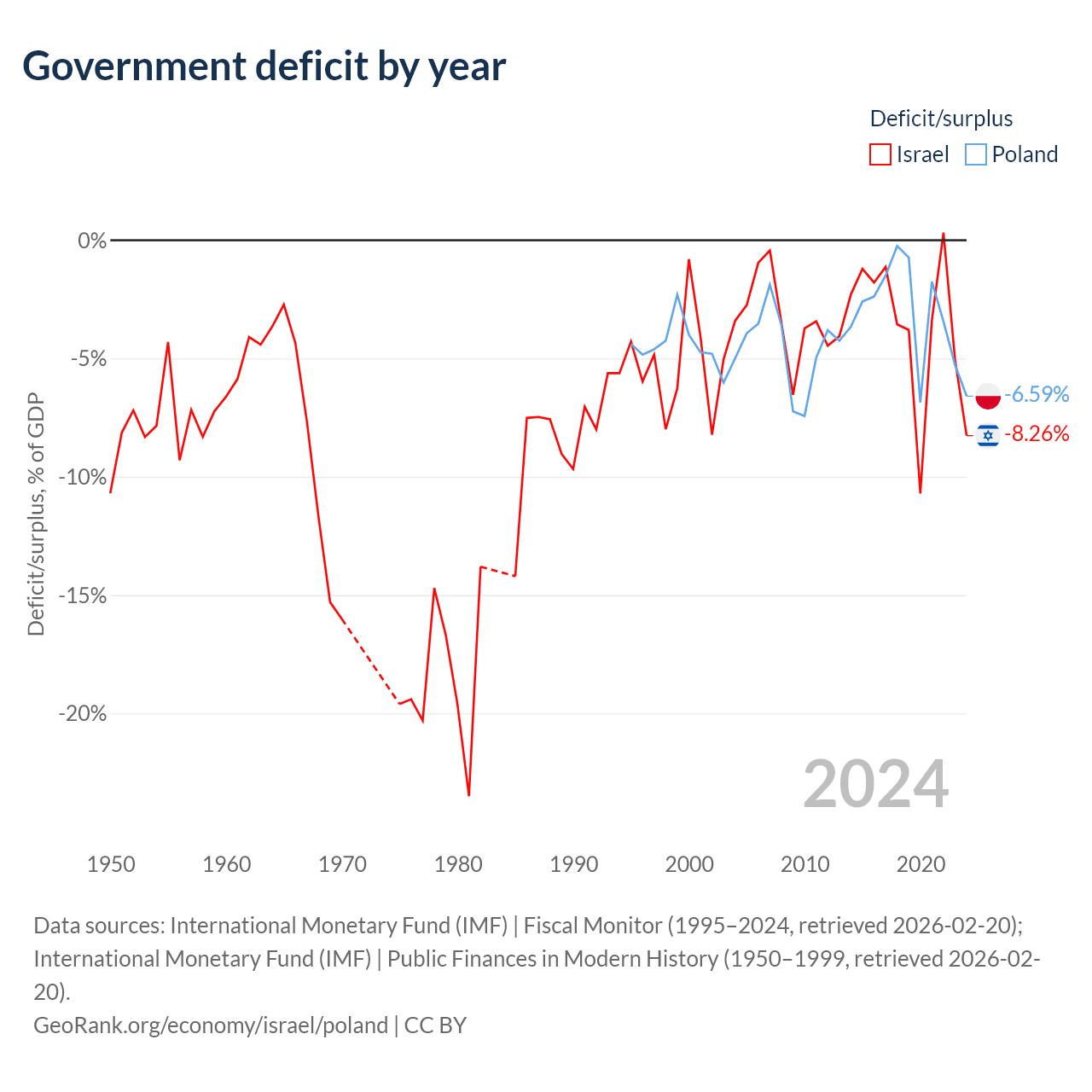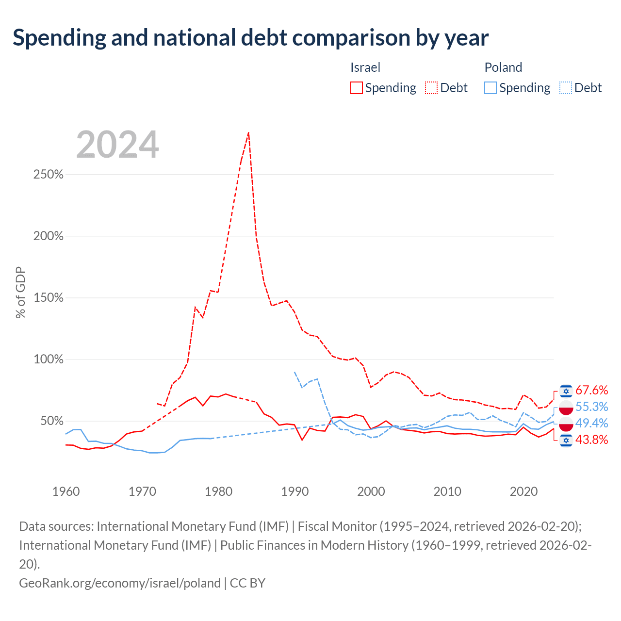 Israel has $366B in government debt (67.6% of GDP), compared to $507B (55.3% of GDP) in Poland.
