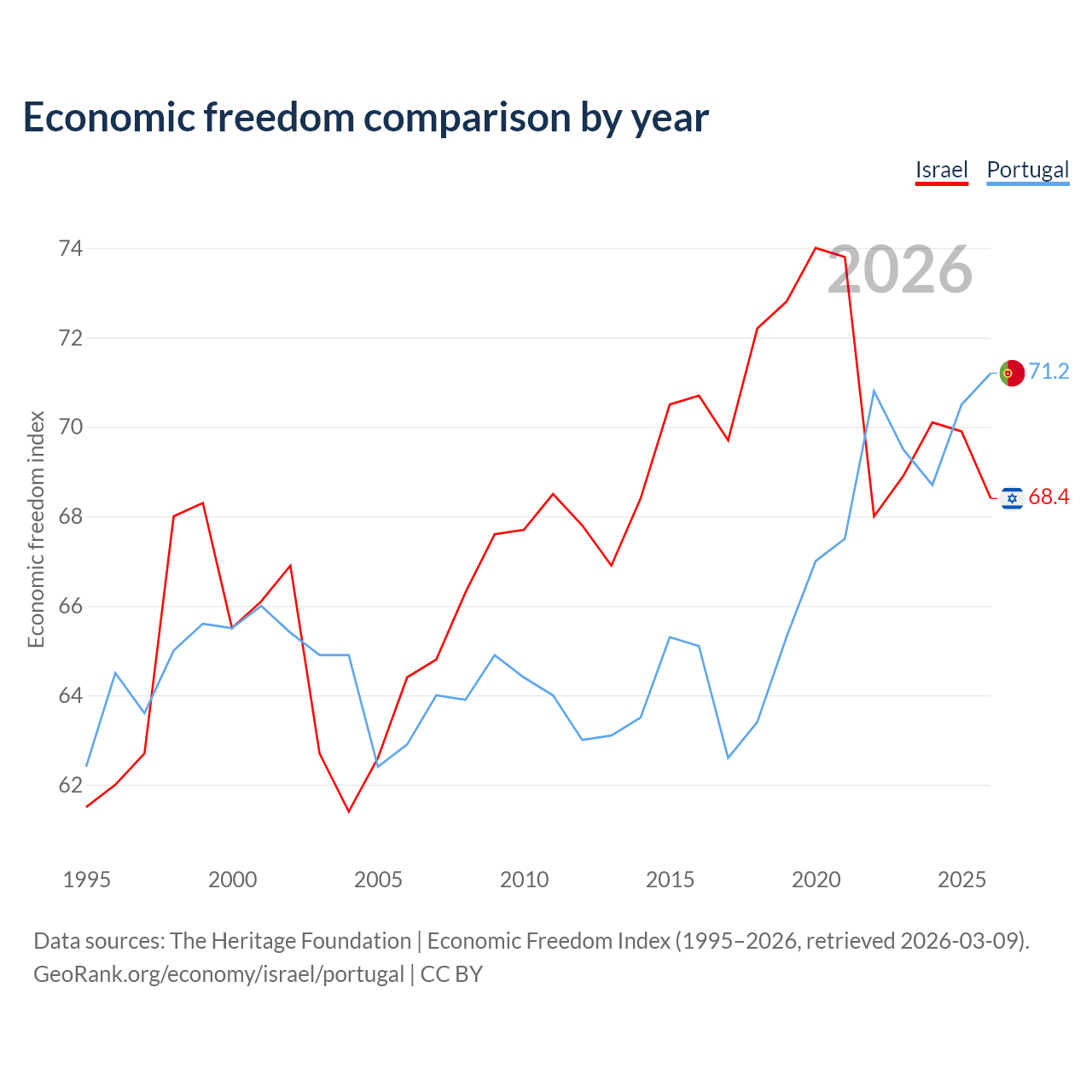 The Economic Freedom Index for Israel is 68.4, ranking 47/197, compared to 71.2 for Portugal, ranking 33/197. The chart above displays a comparison of annual changes in economic freedom indexes.