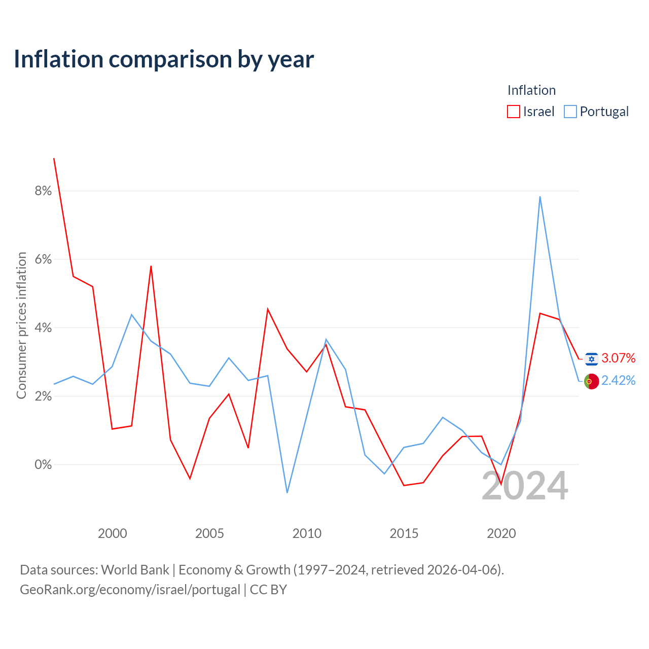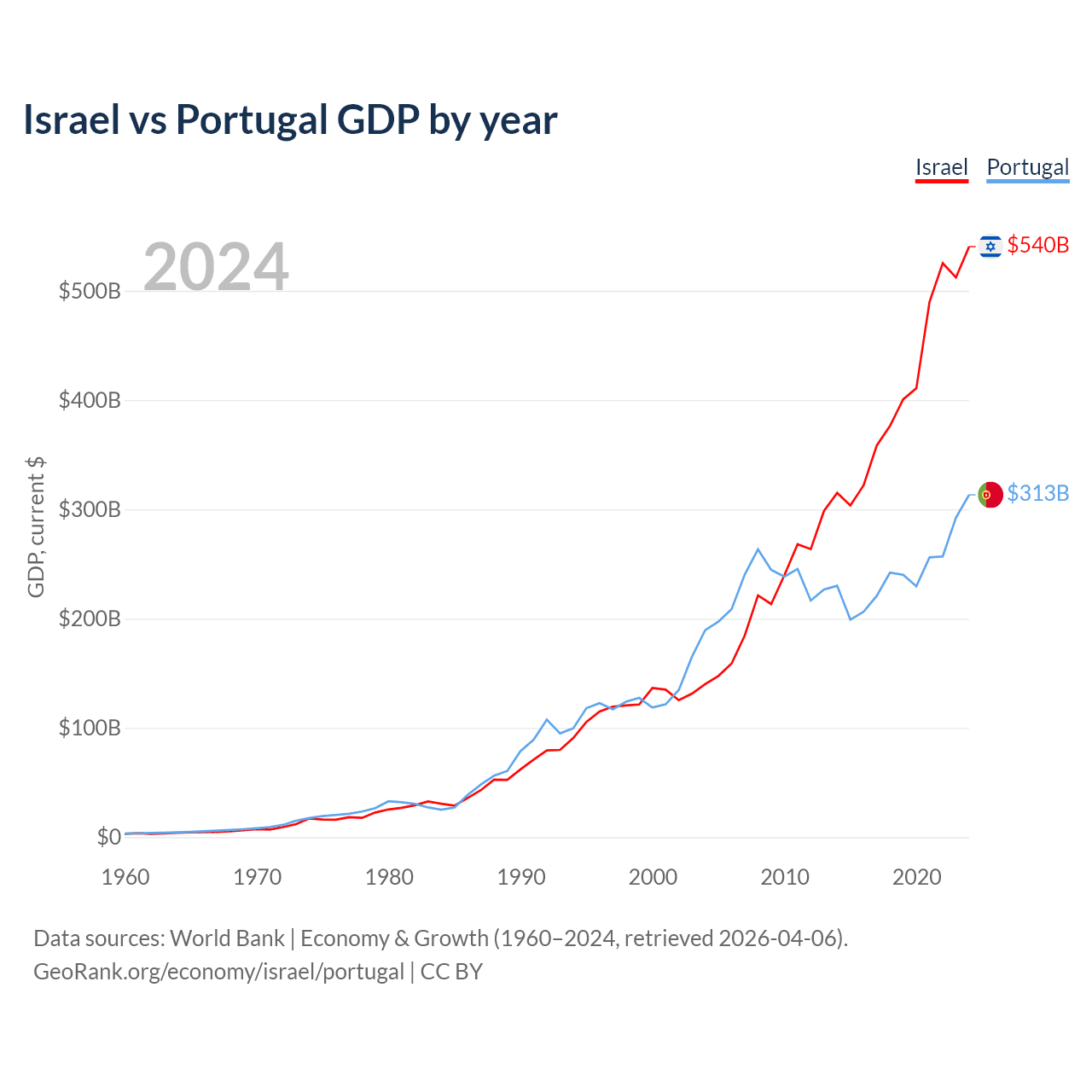 Israel has a GDP of $540B compared to $313B for Portugal, ranking 29/197 and 46/197 by economy size, respectively.