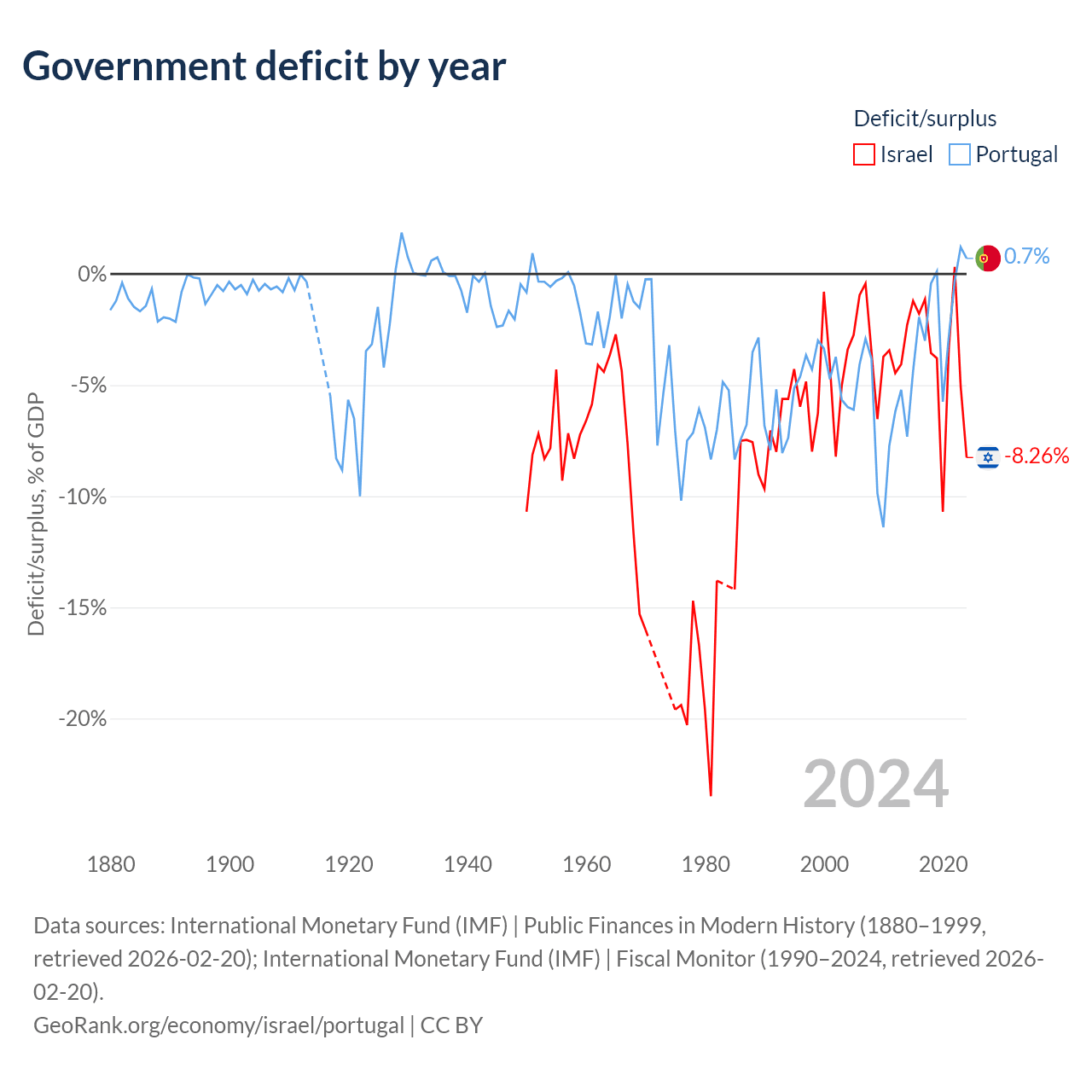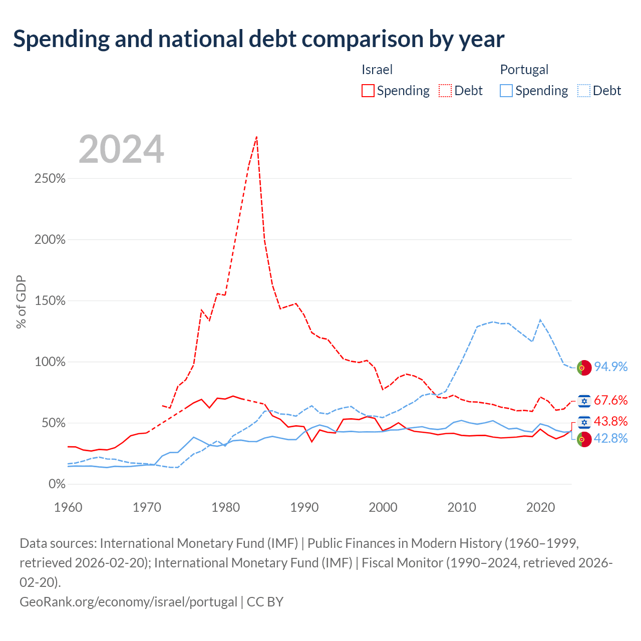 Israel has $366B in government debt (67.6% of GDP), compared to $297B (94.9% of GDP) in Portugal.