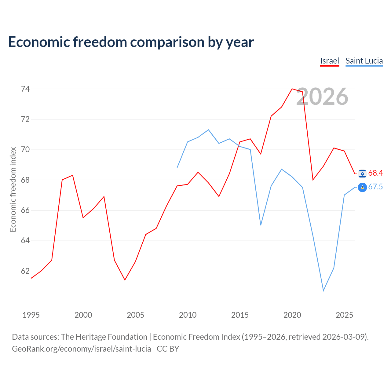 The Economic Freedom Index for Israel is 68.4, ranking 47/197, compared to 67.5 for Saint Lucia, ranking 57/197. The chart above displays a comparison of annual changes in economic freedom indexes.