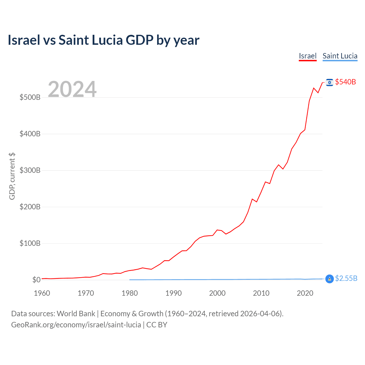 Israel has a GDP of $540B compared to $2.55B for Saint Lucia, ranking 29/197 and 173/197 by economy size, respectively.