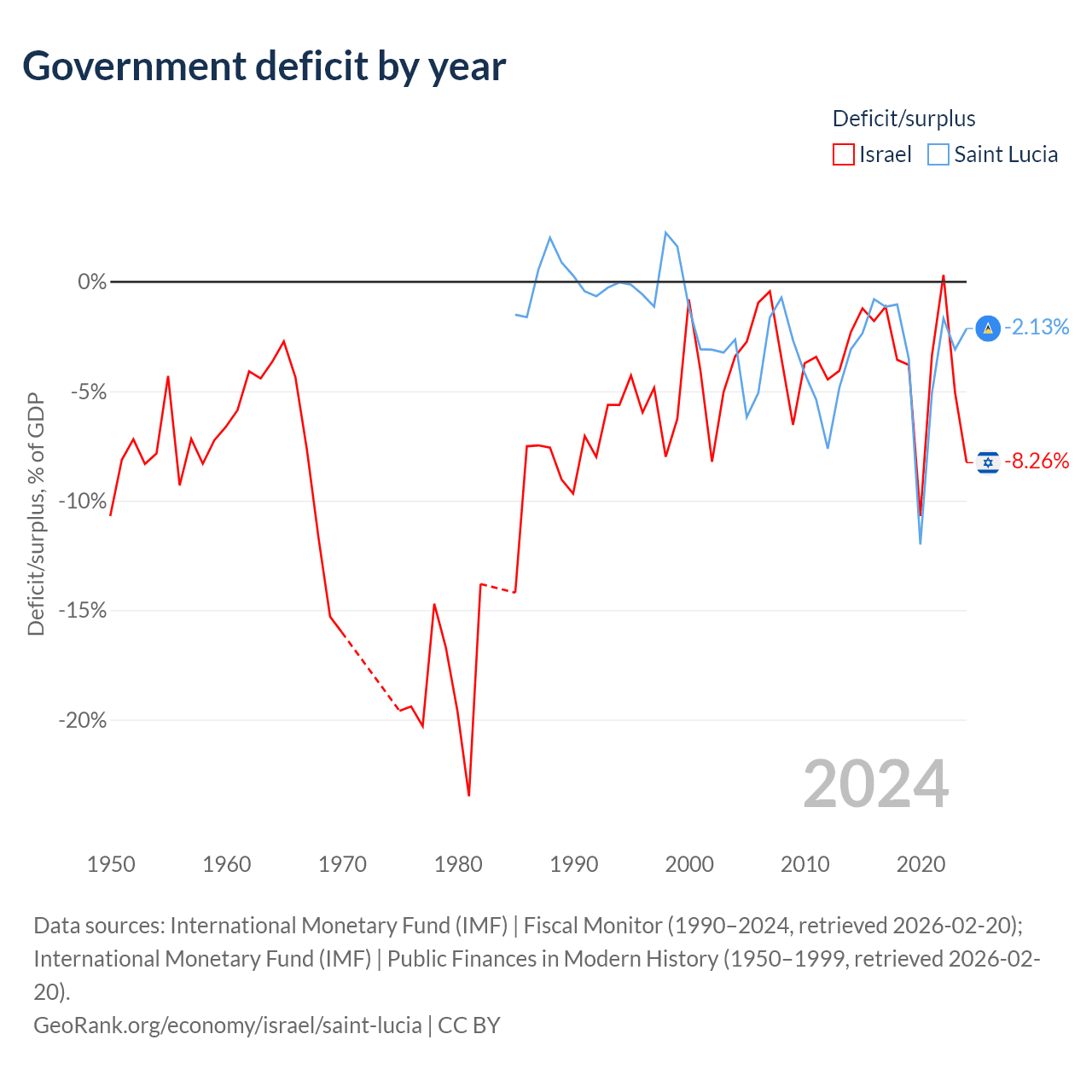 Israel has $366B in government debt (67.6% of GDP), compared to $1.97B (77.2% of GDP) in Saint Lucia.