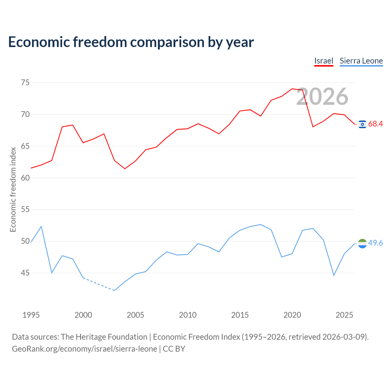 The Economic Freedom Index for Israel is 68.4, ranking 47/197, compared to 49.6 for Sierra Leone, ranking 165/197. The chart above displays a comparison of annual changes in economic freedom indexes.