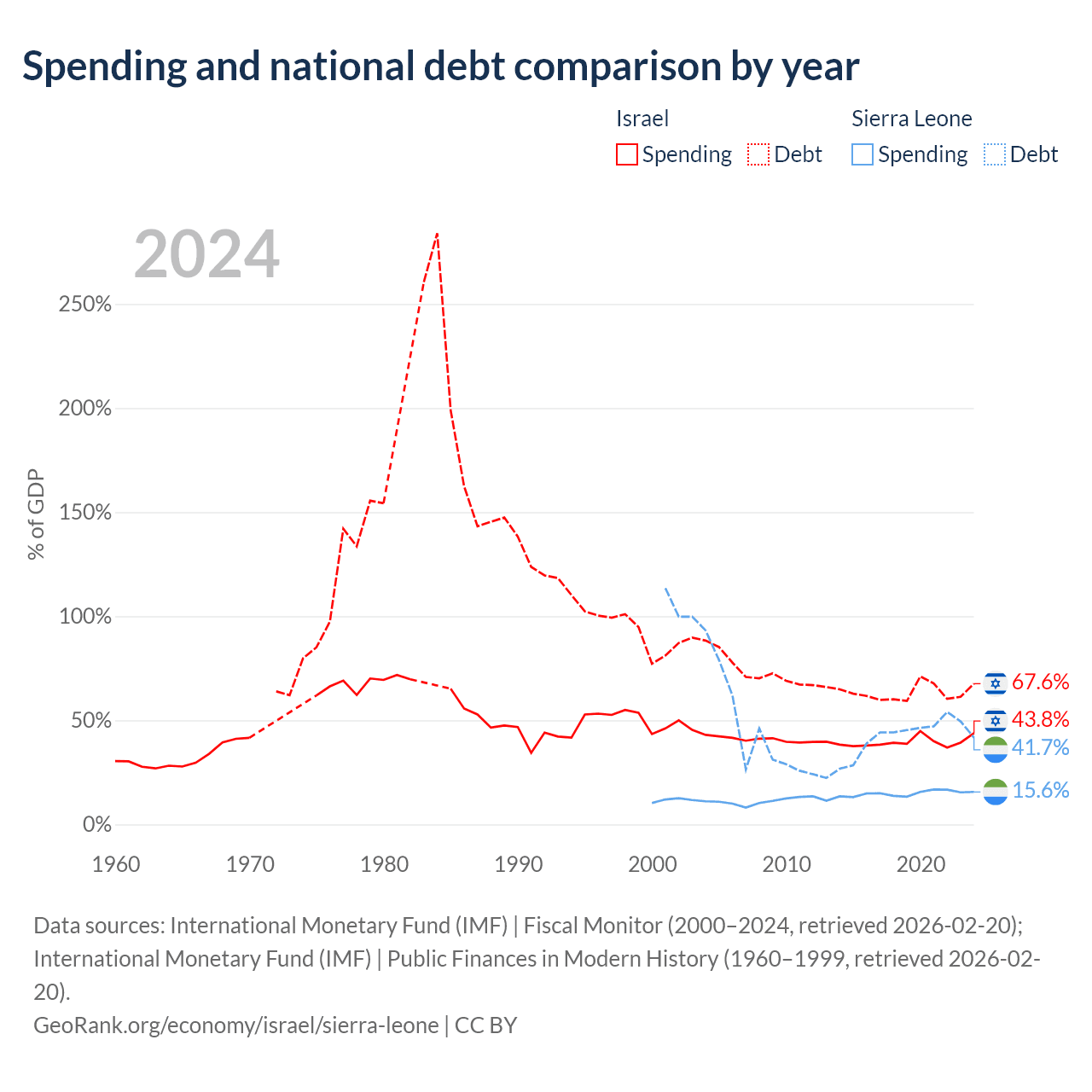 Israel has $366B in government debt (67.6% of GDP), compared to $2.91B (41.7% of GDP) in Sierra Leone.