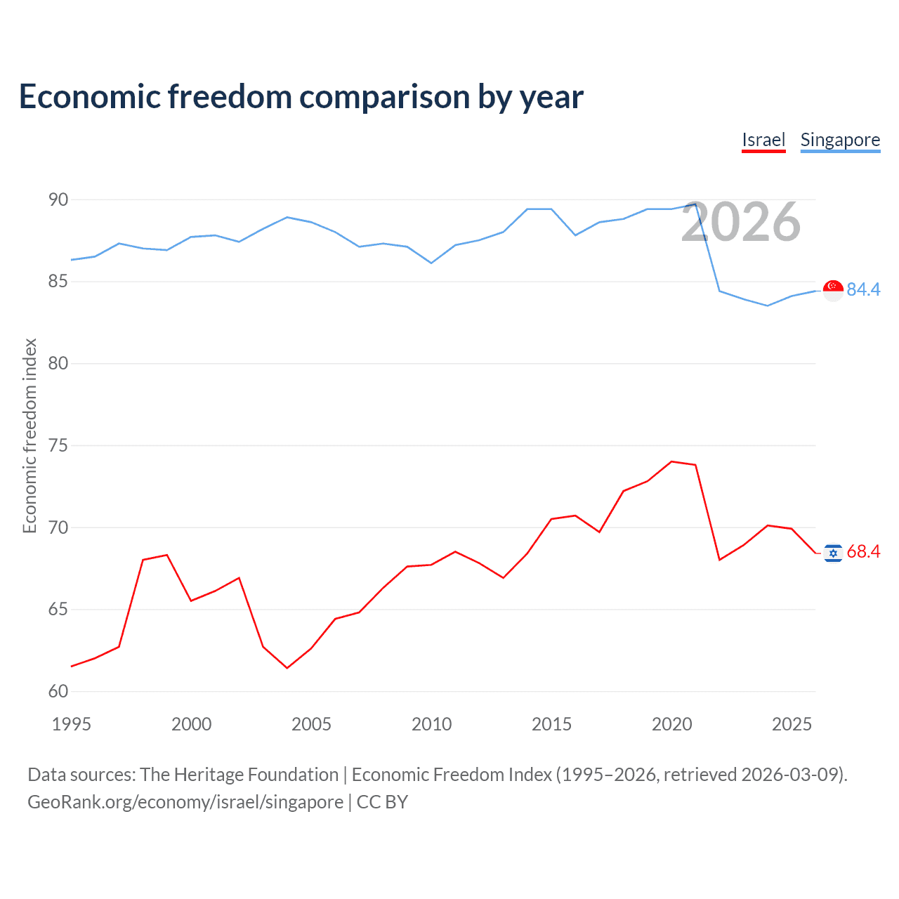 The Economic Freedom Index for Israel is 68.4, ranking 47/197, compared to 84.4 for Singapore, ranking 1/197. The chart above displays a comparison of annual changes in economic freedom indexes.