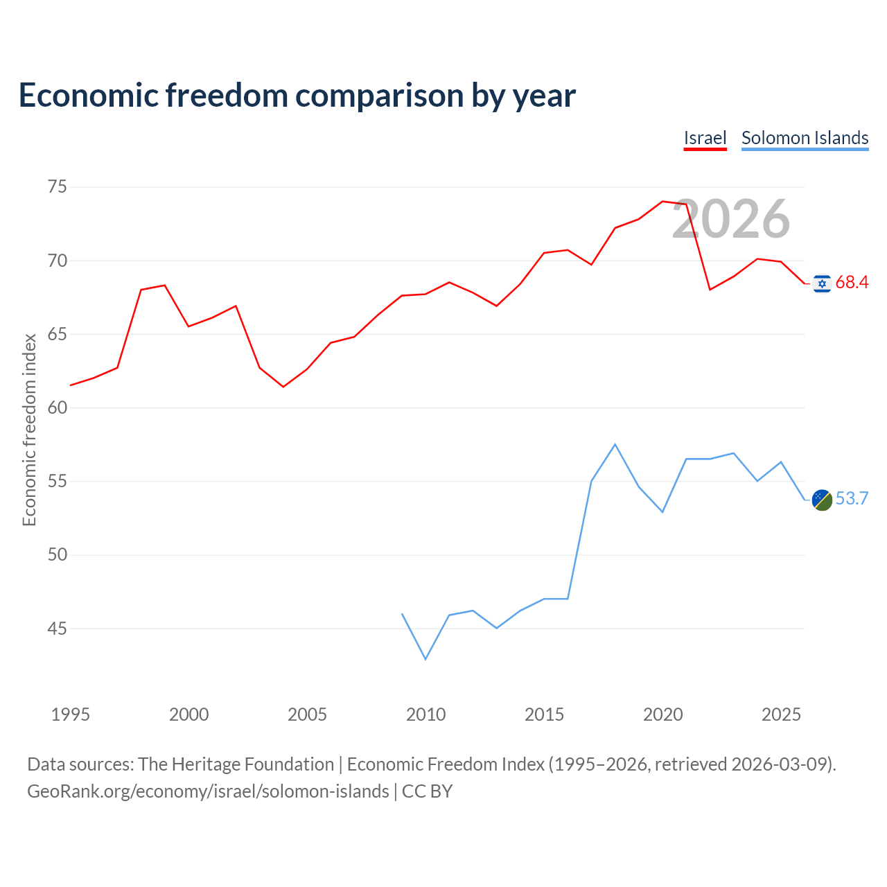 The Economic Freedom Index for Israel is 68.4, ranking 47/197, compared to 53.7 for the Solomon Islands, ranking 137/197. The chart above displays a comparison of annual changes in economic freedom indexes.
