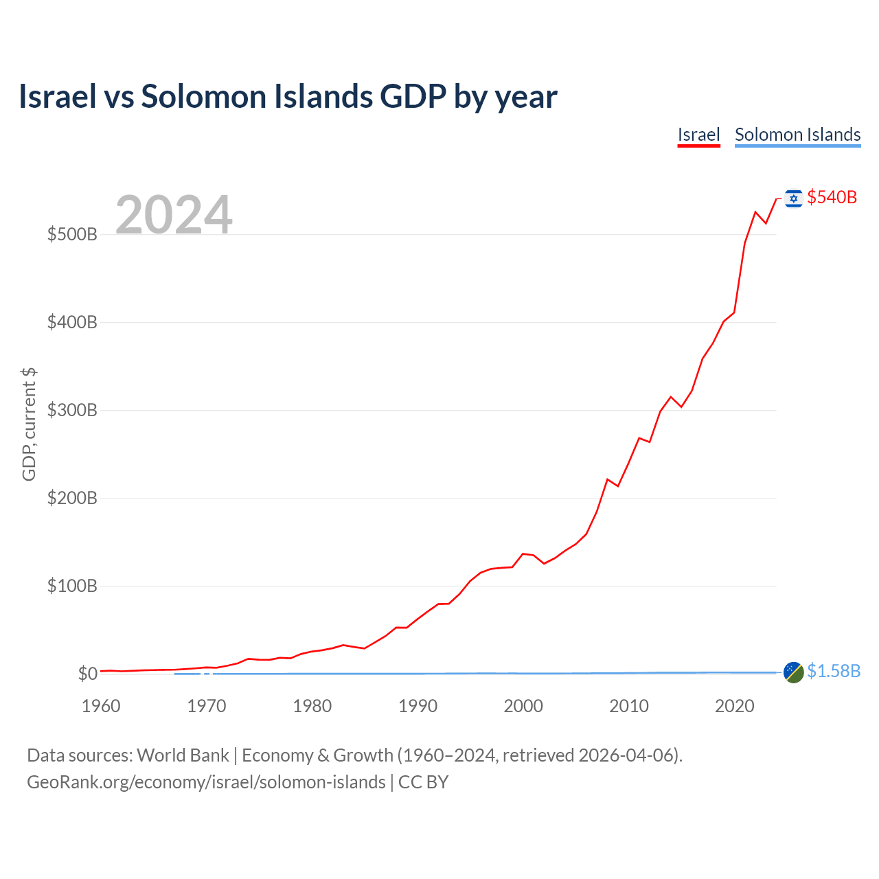 Israel has a GDP of $540B compared to $1.58B for the Solomon Islands, ranking 29/197 and 182/197 by economy size, respectively.