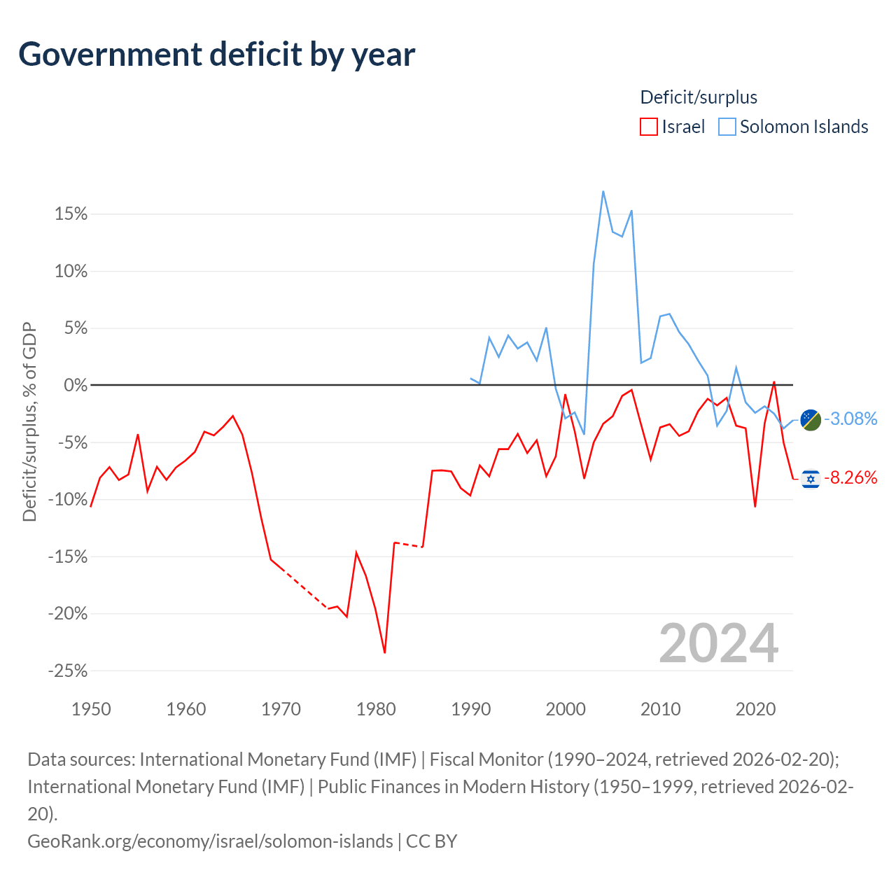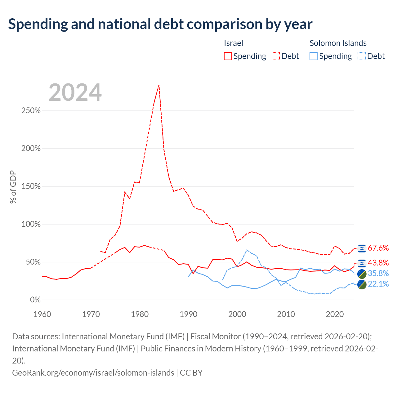 Israel has $366B in government debt (67.6% of GDP), compared to $350M (22.1% of GDP) in the Solomon Islands.