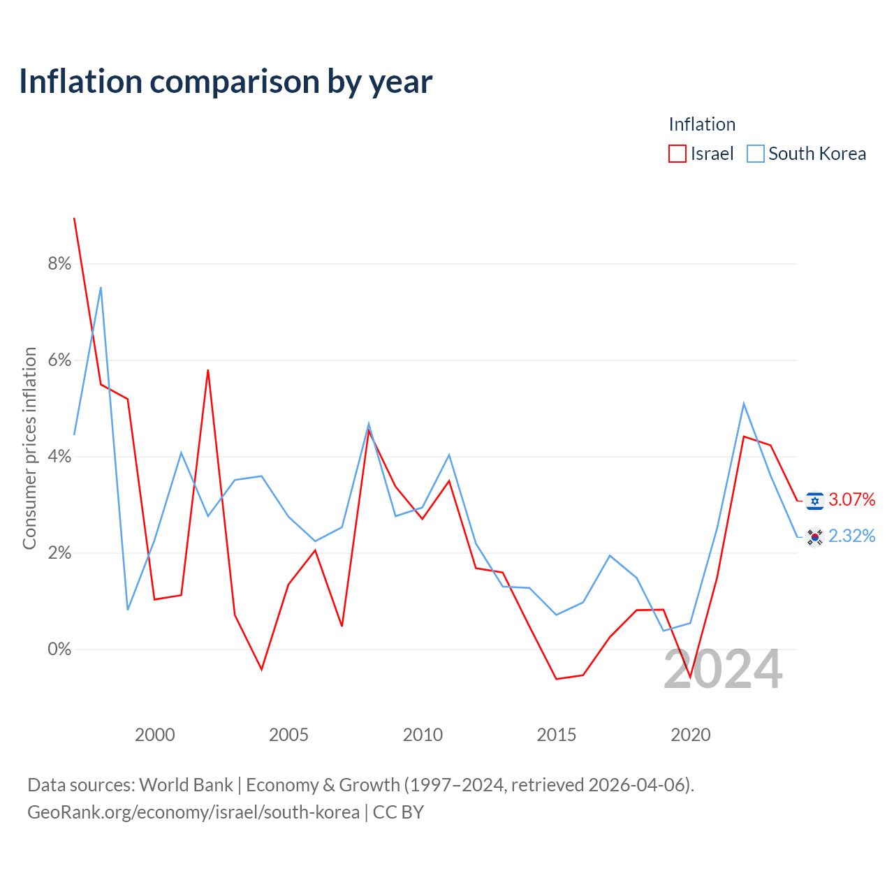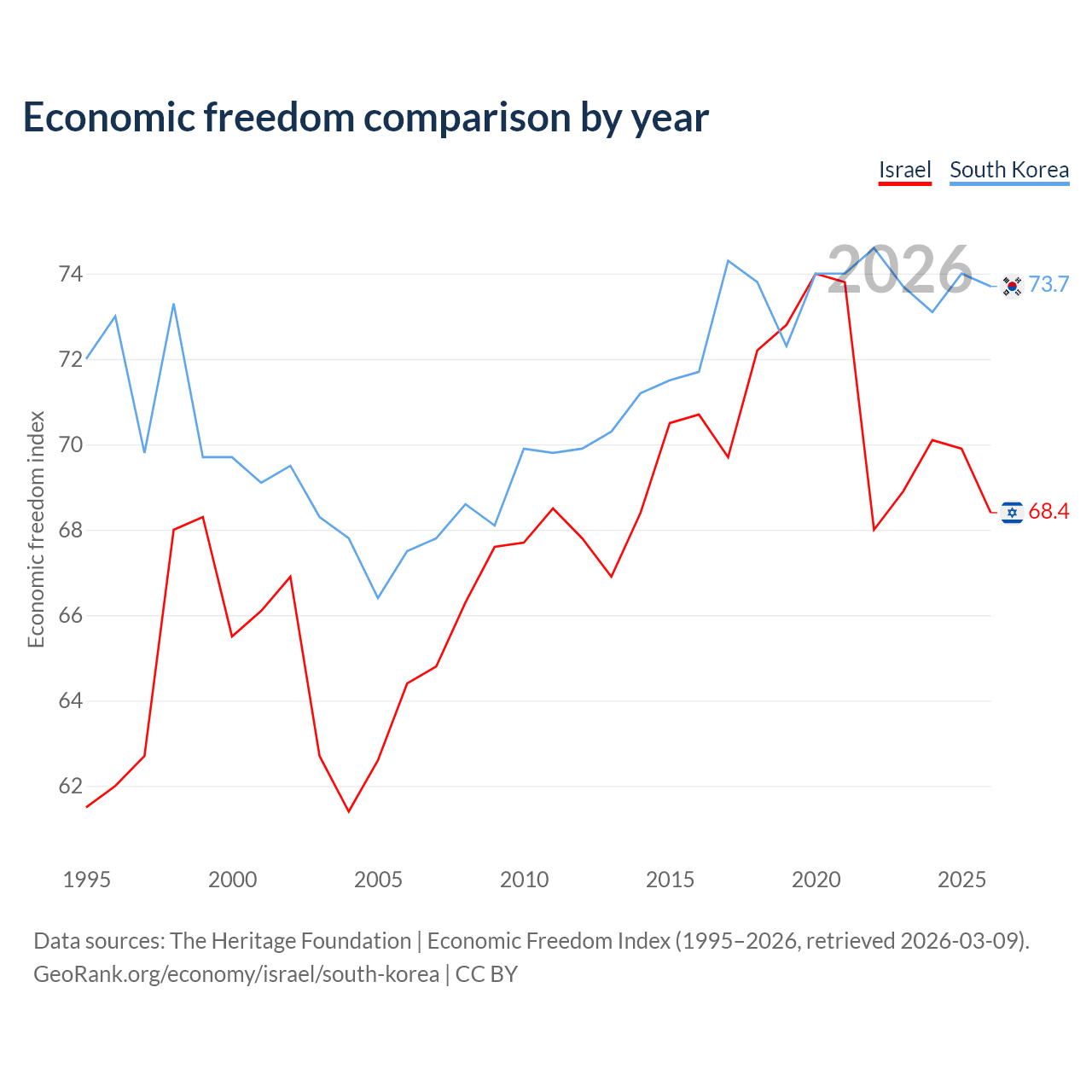The Economic Freedom Index for Israel is 68.4, ranking 47/197, compared to 73.7 for South Korea, ranking 24/197. The chart above displays a comparison of annual changes in economic freedom indexes.