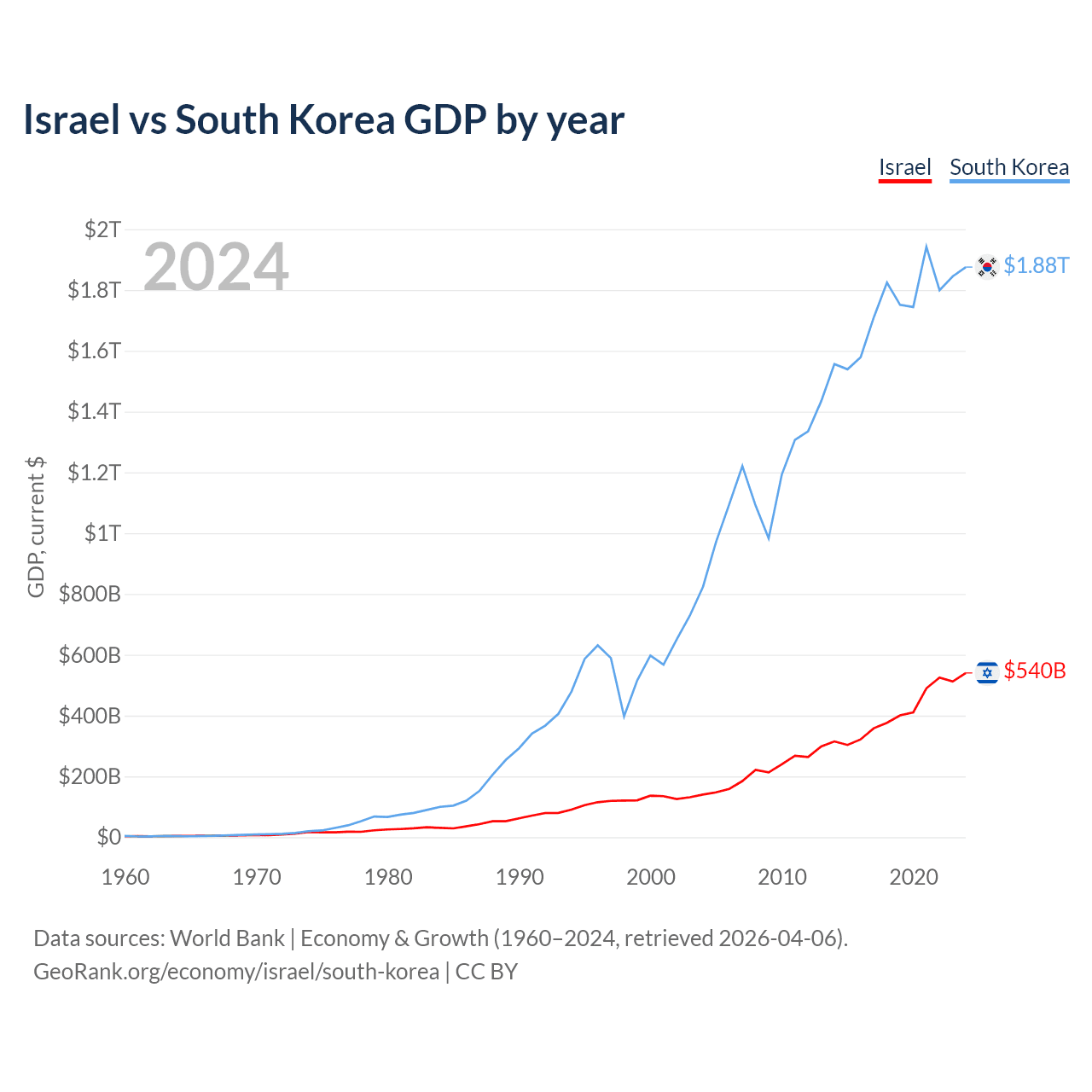 Israel has a GDP of $540B compared to $1.88T for South Korea, ranking 29/197 and 12/197 by economy size, respectively.