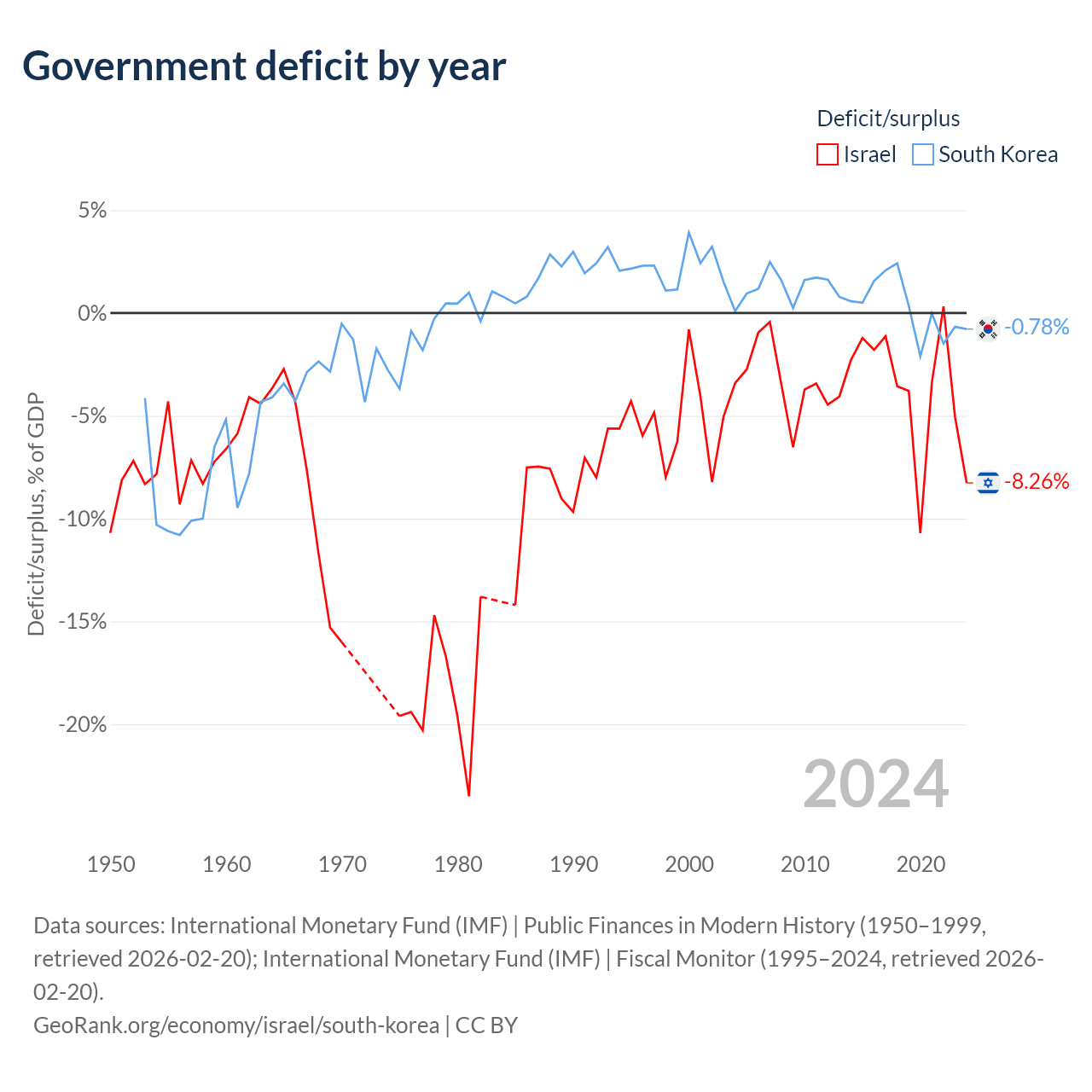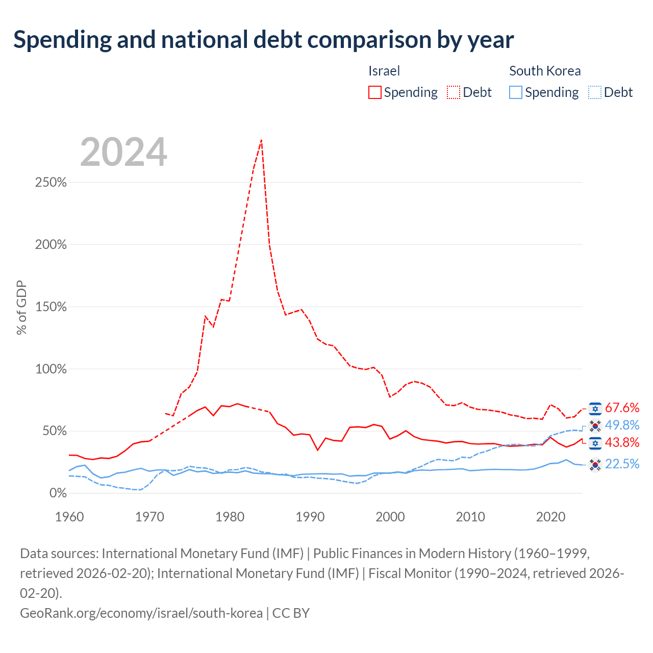 Israel has $366B in government debt (67.6% of GDP), compared to $934B (49.8% of GDP) in South Korea.
