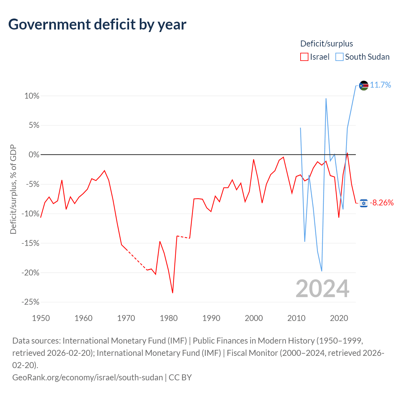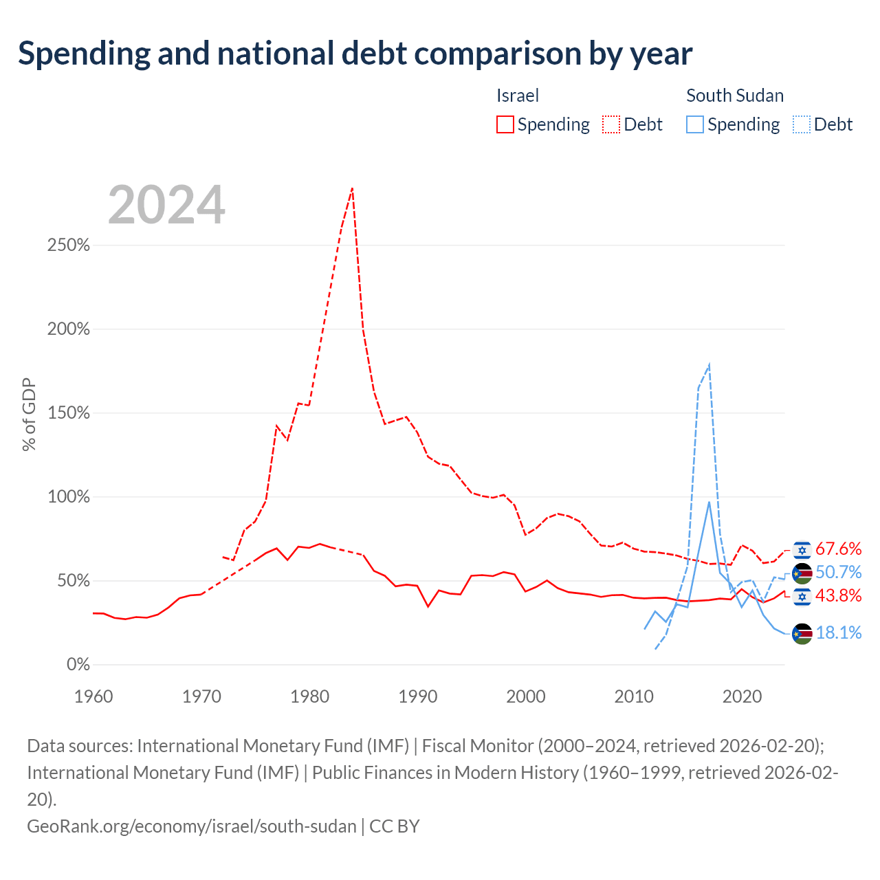 Israel has $366B in government debt (67.6% of GDP), compared to $7.04B (50.7% of GDP) in South Sudan.