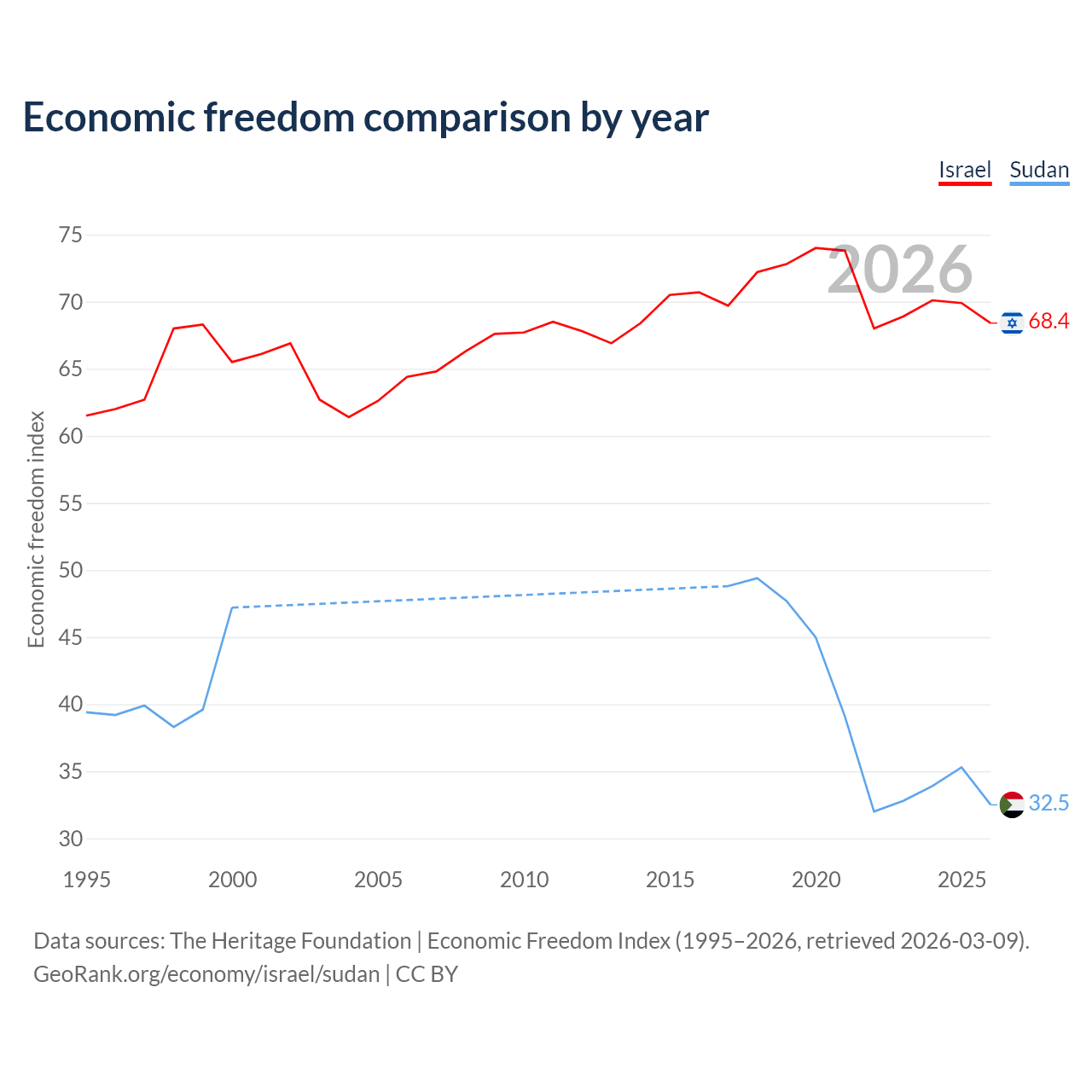The Economic Freedom Index for Israel is 68.4, ranking 47/197, compared to 32.5 for Sudan, ranking 191/197. The chart above displays a comparison of annual changes in economic freedom indexes.