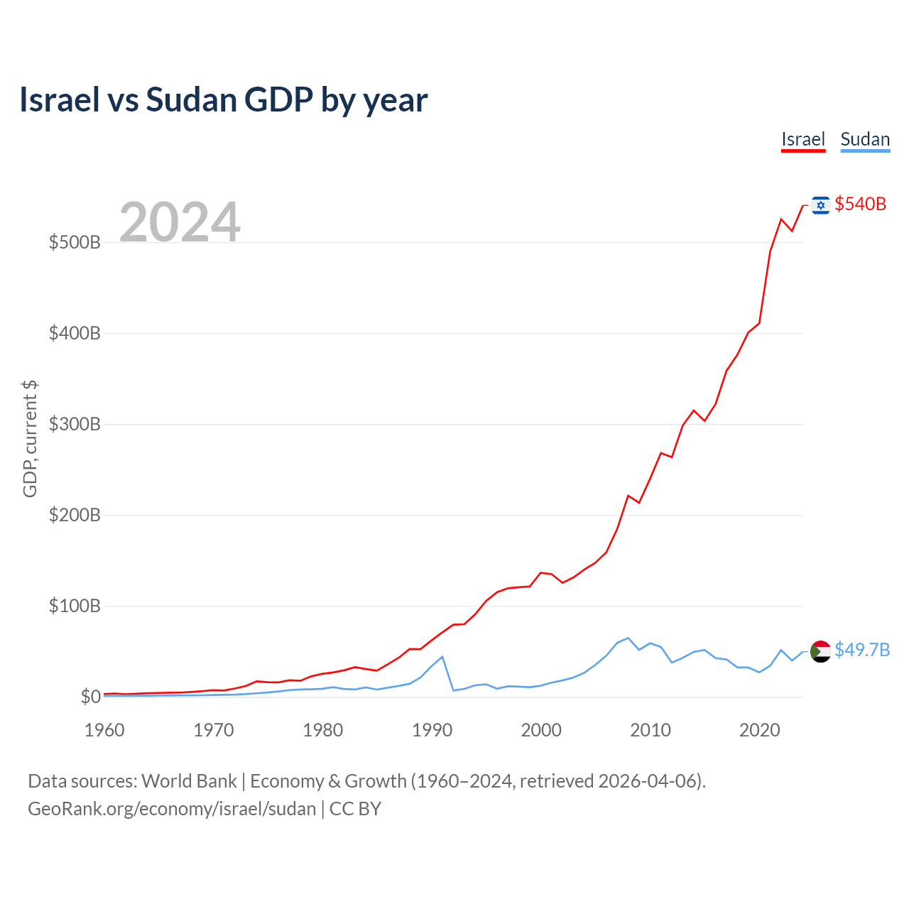 Israel has a GDP of $540B compared to $49.7B for Sudan, ranking 29/197 and 94/197 by economy size, respectively.