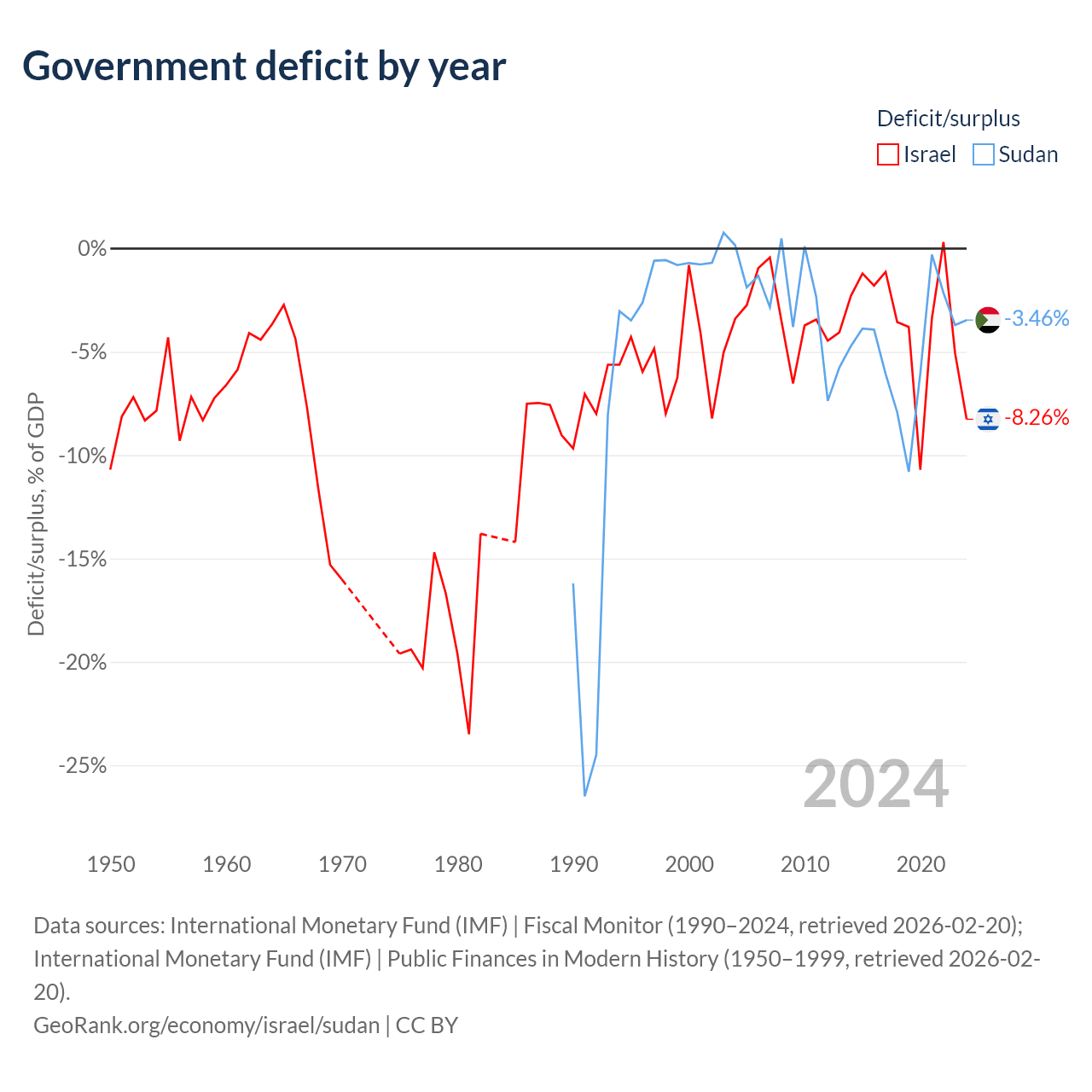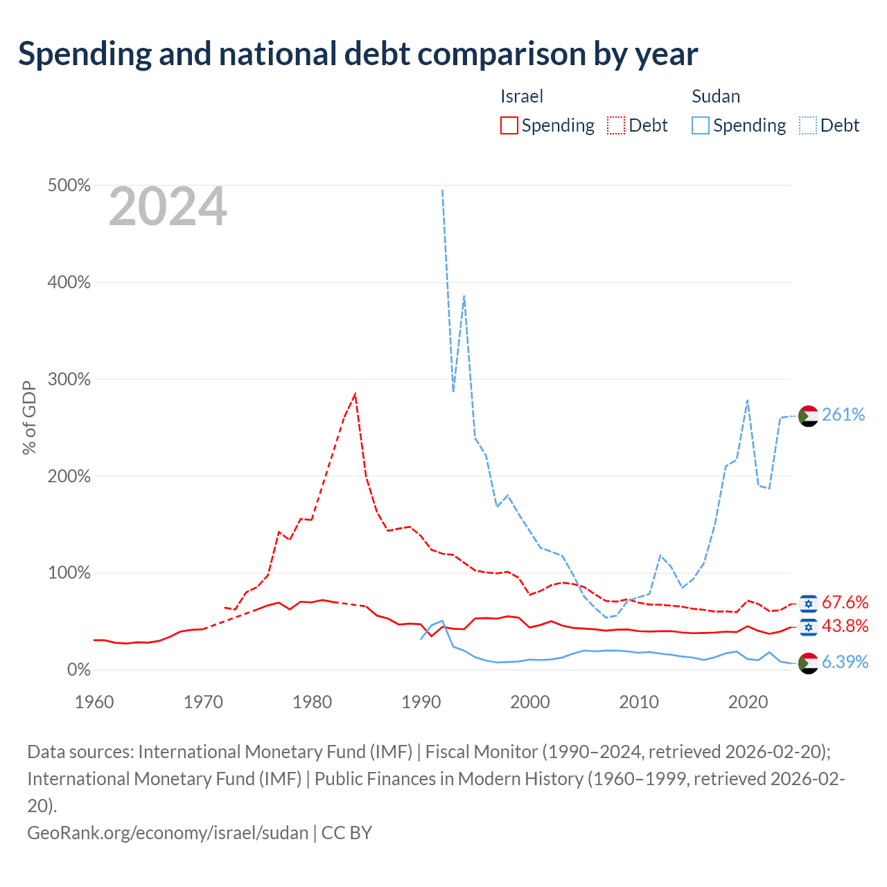 Israel has $366B in government debt (67.6% of GDP), compared to $130B (261.4% of GDP) in Sudan.