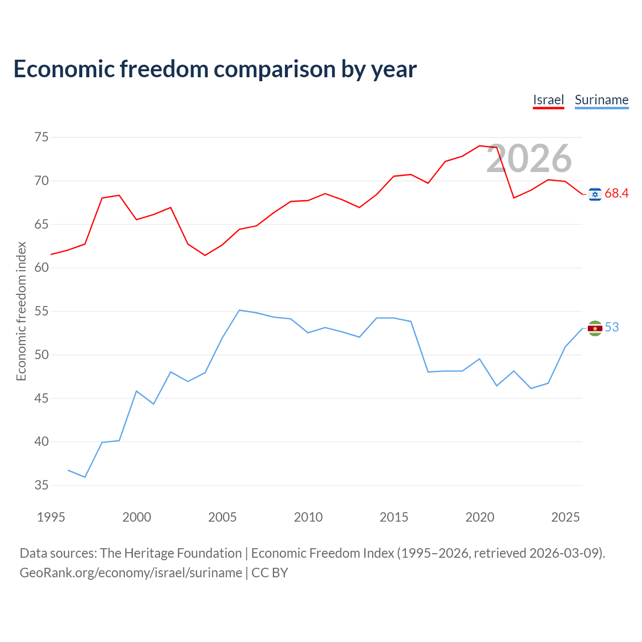 The Economic Freedom Index for Israel is 68.4, ranking 47/197, compared to 53 for Suriname, ranking 143/197. The chart above displays a comparison of annual changes in economic freedom indexes.