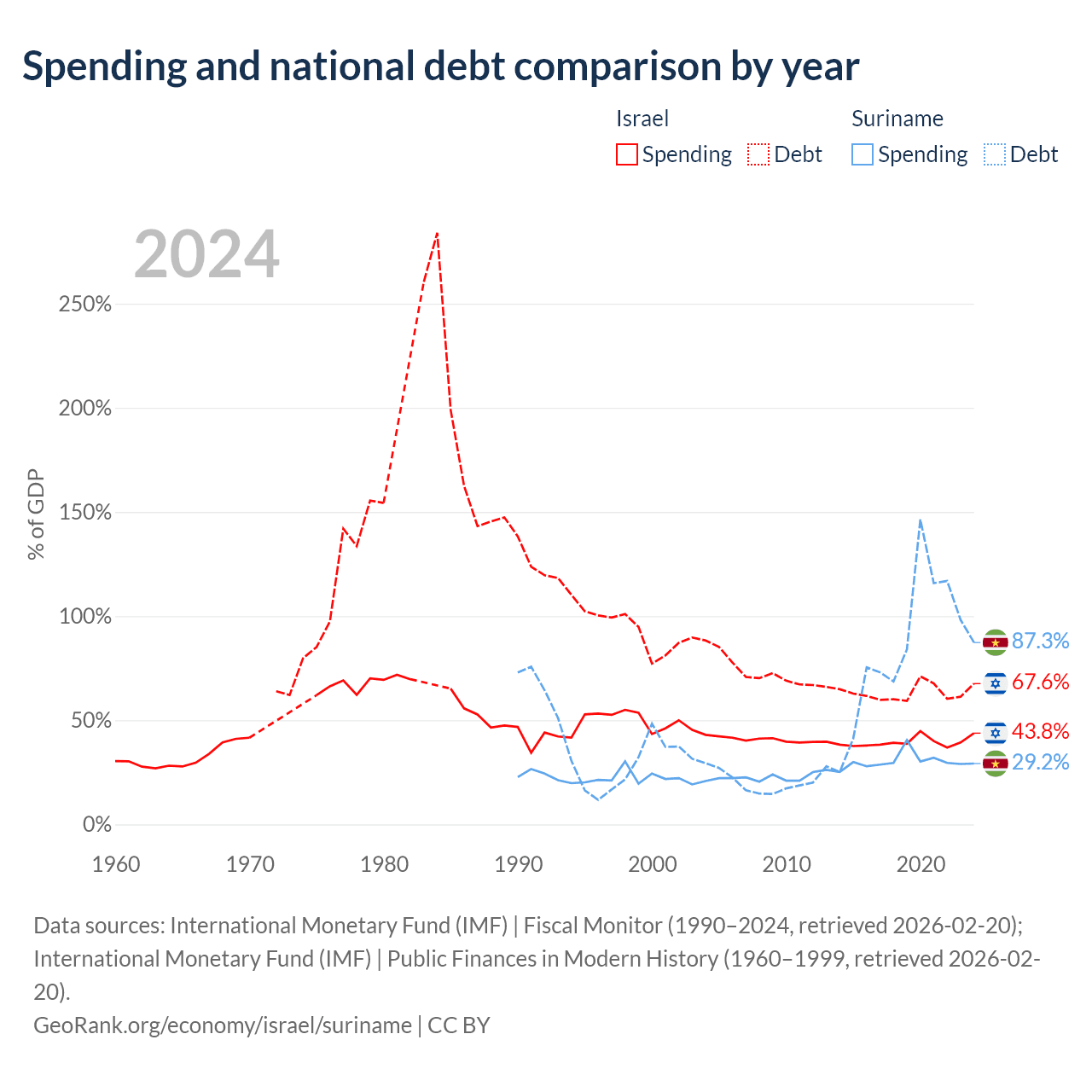 Israel has $366B in government debt (67.6% of GDP), compared to $3.86B (87.3% of GDP) in Suriname.