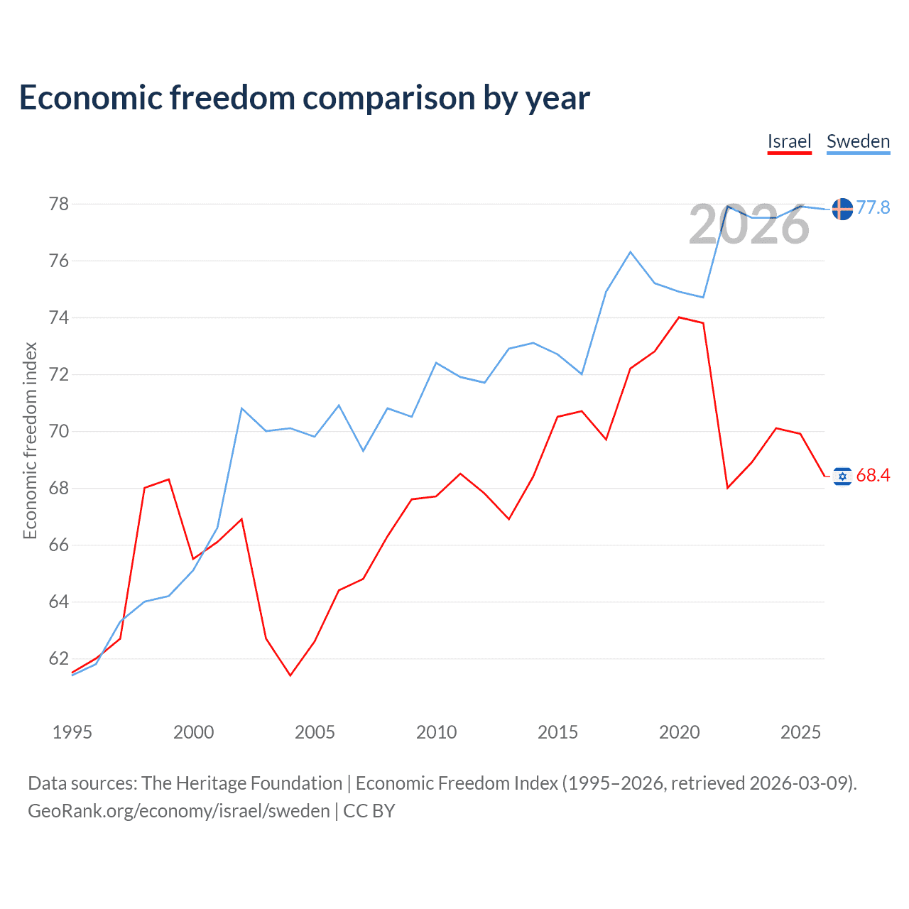 The Economic Freedom Index for Israel is 68.4, ranking 47/197, compared to 77.8 for Sweden, ranking 14/197. The chart above displays a comparison of annual changes in economic freedom indexes.