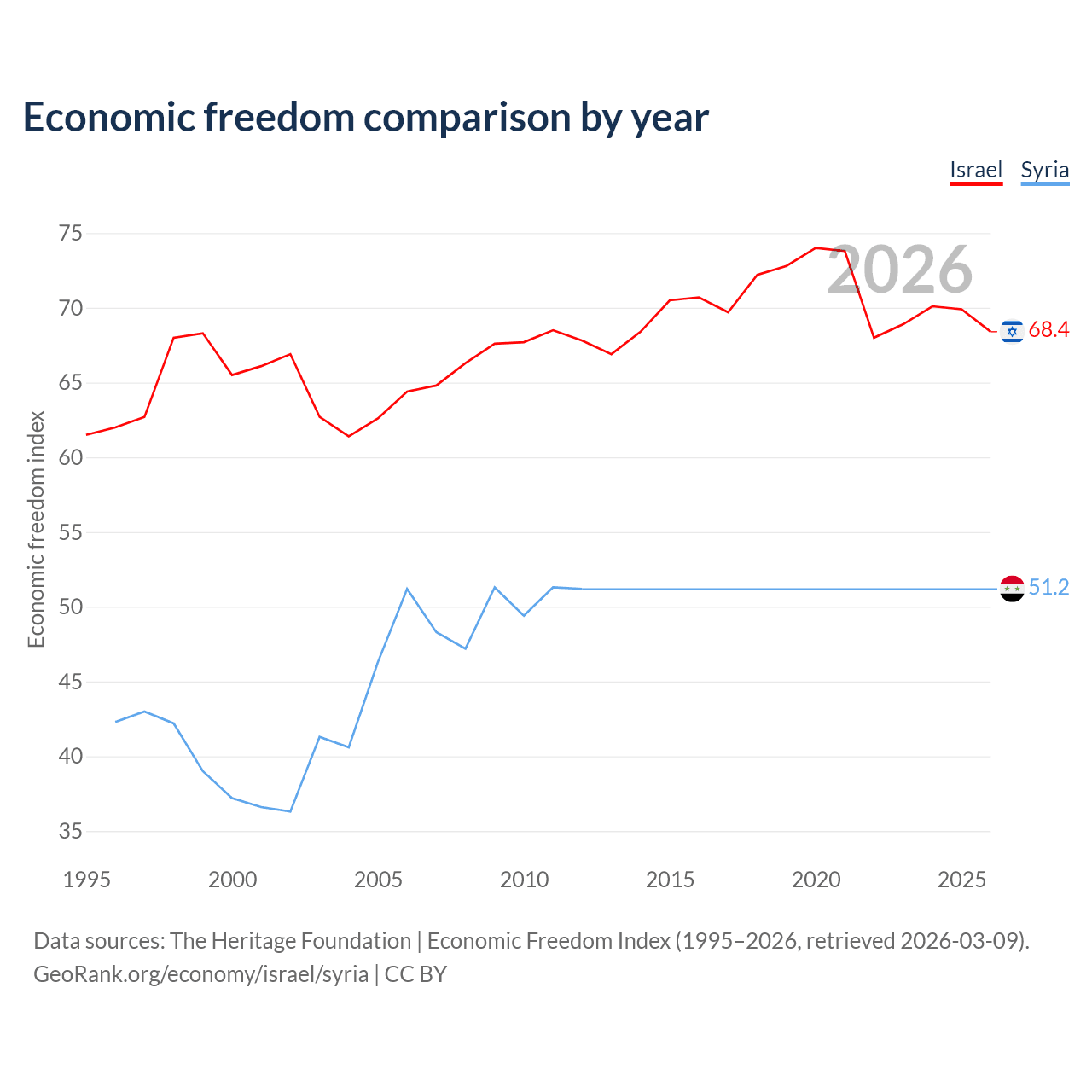 The Economic Freedom Index for Israel is 68.4, ranking 47/197, compared to 51.2 for Syria, ranking 155/197. The chart above displays a comparison of annual changes in economic freedom indexes.