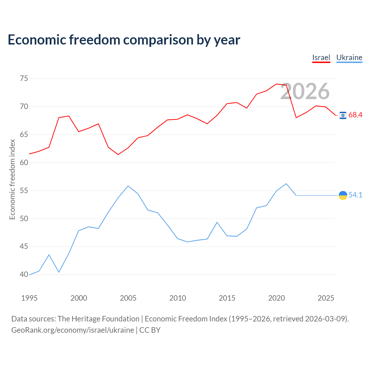 The Economic Freedom Index for Israel is 68.4, ranking 47/197, compared to 54.1 for Ukraine, ranking 135/197. The chart above displays a comparison of annual changes in economic freedom indexes.