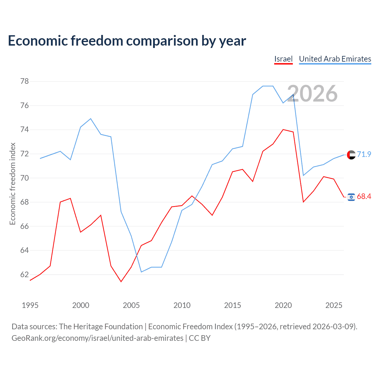 The Economic Freedom Index for Israel is 68.4, ranking 47/197, compared to 71.9 for the United Arab Emirates, ranking 29/197. The chart above displays a comparison of annual changes in economic freedom indexes.