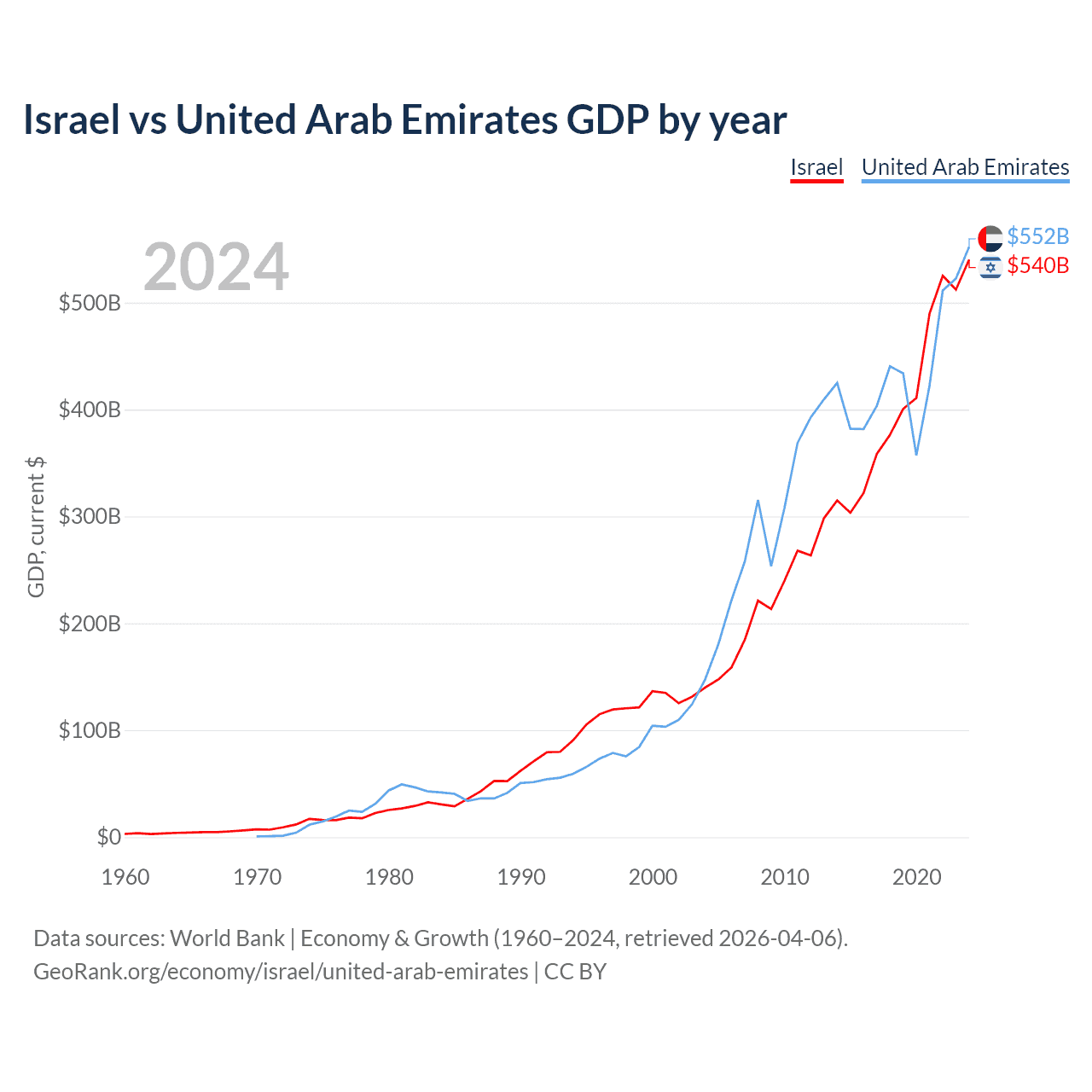 Israel has a GDP of $540B compared to $552B for the United Arab Emirates, ranking 29/197 and 27/197 by economy size, respectively.