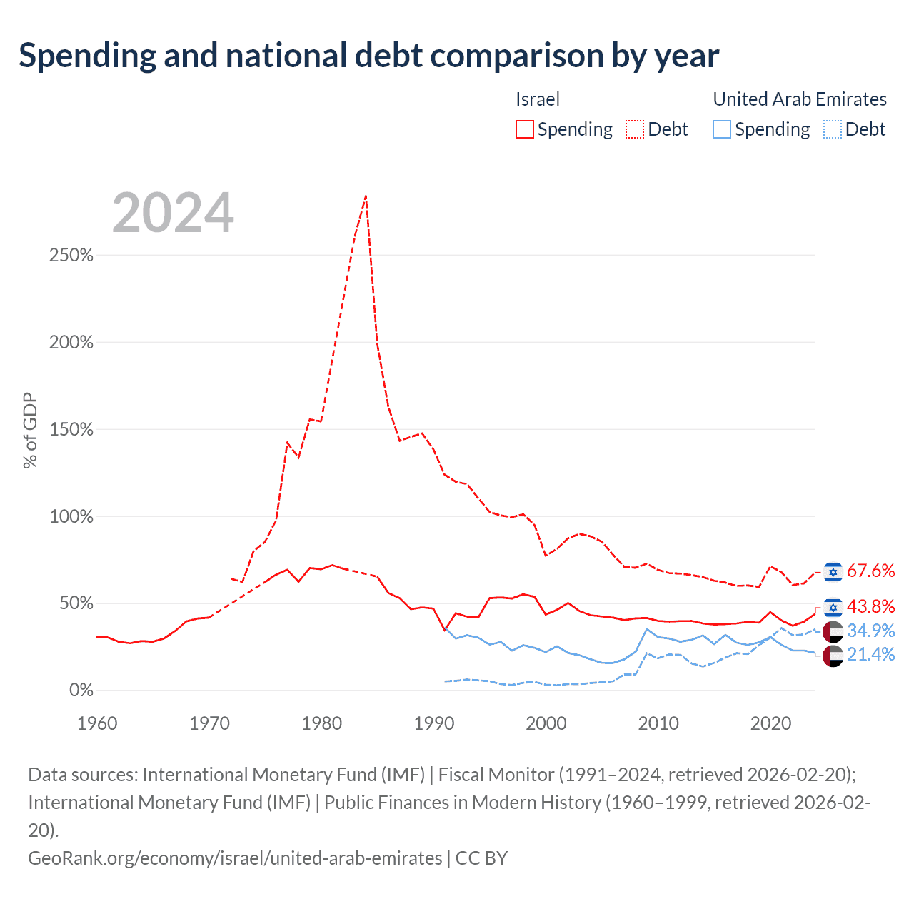Israel has $366B in government debt (67.6% of GDP), compared to $193B (34.9% of GDP) in the United Arab Emirates.
