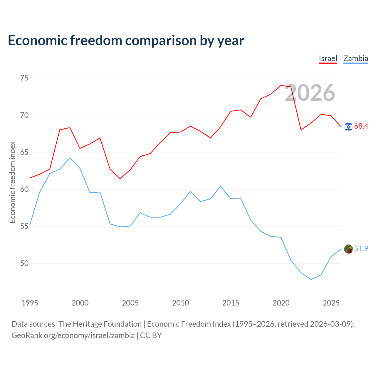 The Economic Freedom Index for Israel is 68.4, ranking 47/197, compared to 51.9 for Zambia, ranking 152/197. The chart above displays a comparison of annual changes in economic freedom indexes.