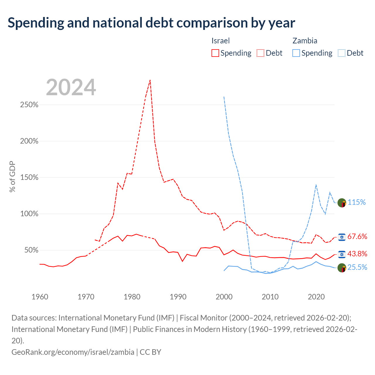 Israel has $366B in government debt (67.6% of GDP), compared to $29.1B (114.9% of GDP) in Zambia.