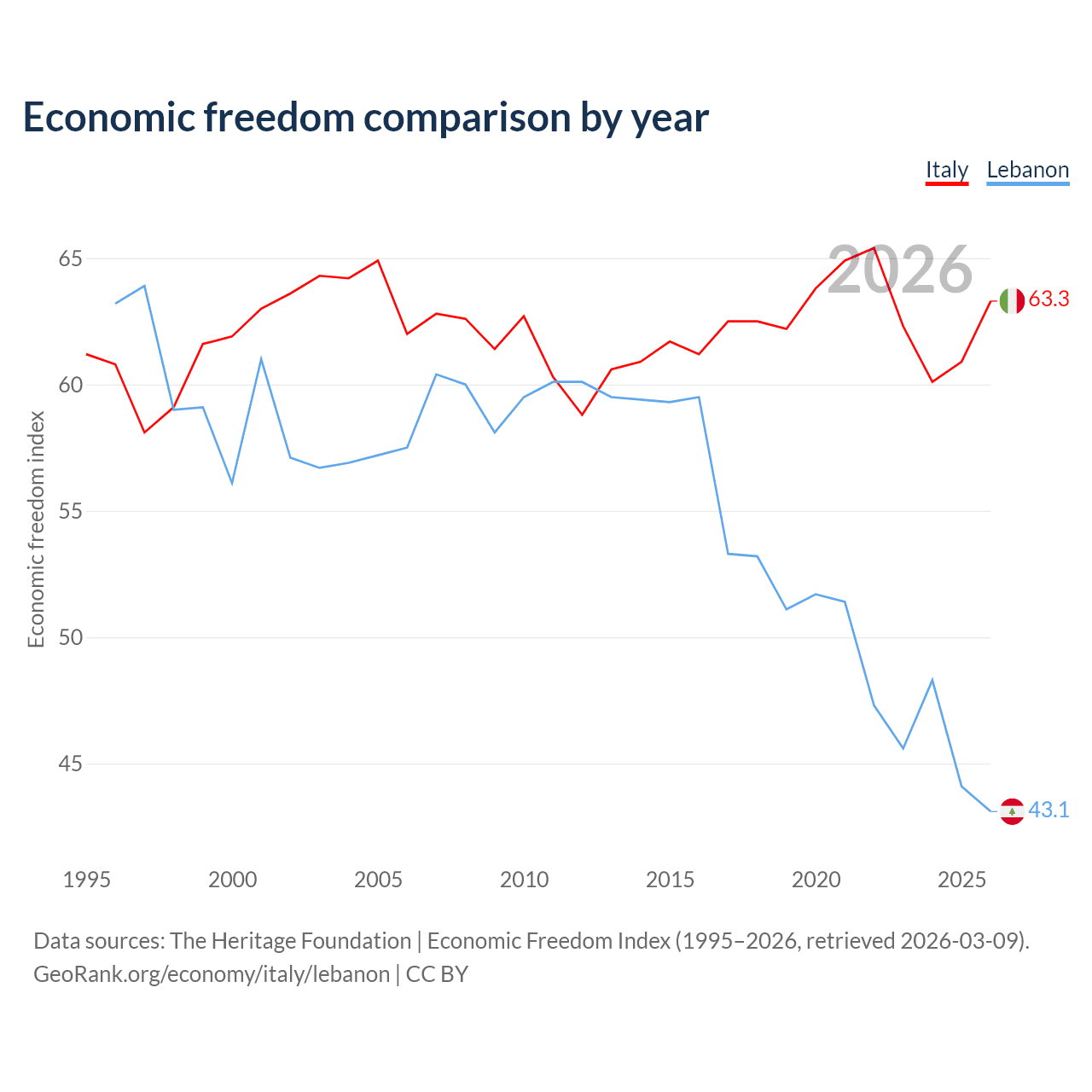 The Economic Freedom Index for Italy is 63.3, ranking 80/197, compared to 43.1 for Lebanon, ranking 183/197. The chart above displays a comparison of annual changes in economic freedom indexes.